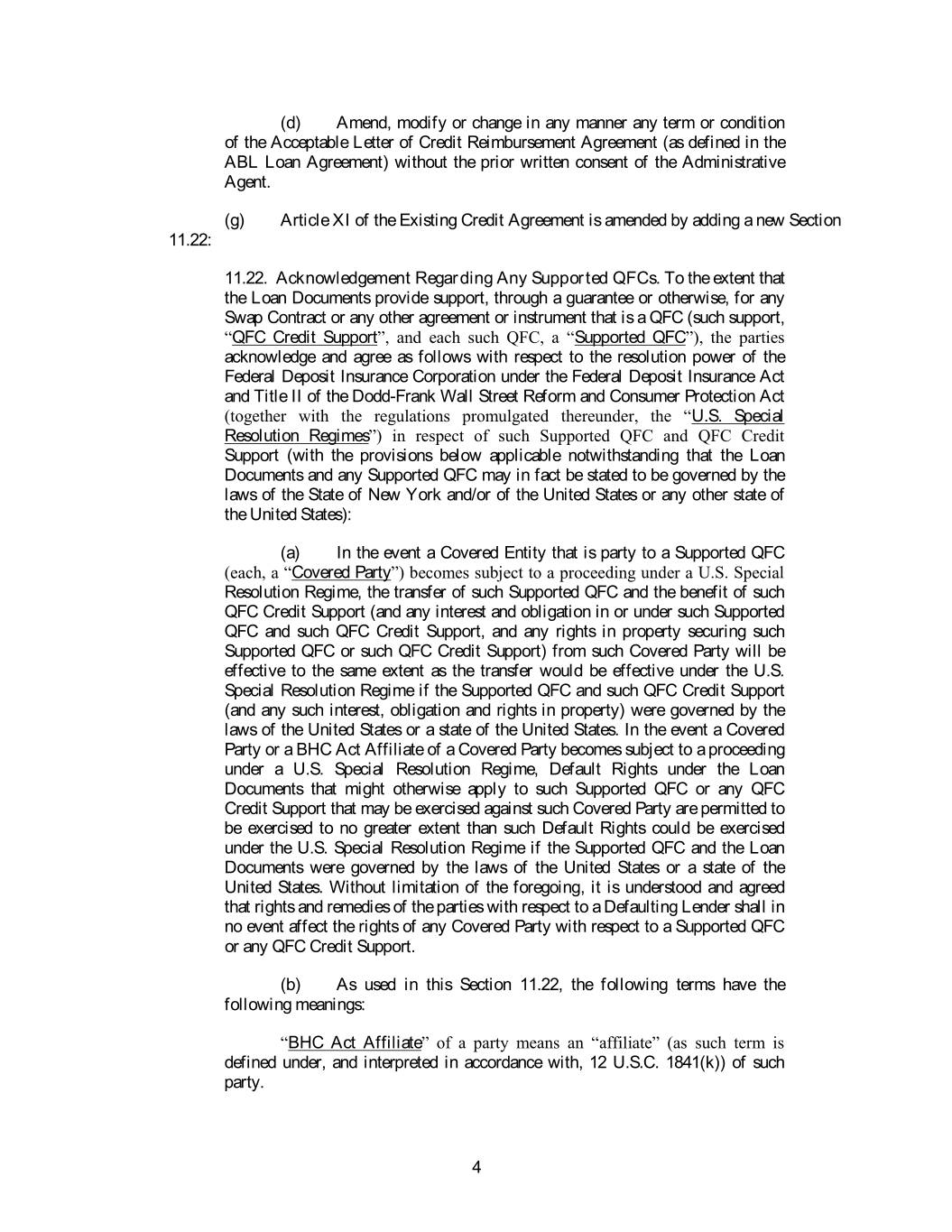 (d) Amend, modify or change in any manner any term or condition of the Acceptable Letter of Credit Reimbursement Agreement (as defined in the ABL Loan Agreement) without the prior written consent of the Administrative Agent. (g) Article XI of the Existing Credit Agreement is amended by adding a new Section 11.22: 11.22. Acknowledgement Regarding Any Supported QFCs. To the extent that the Loan Documents provide support, through a guarantee or otherwise, for any Swap Contract or any other agreement or instrument that is a QFC (such support, “QFC Credit Support”, and each such QFC, a “Supported QFC”), the parties acknowledge and agree as follows with respect to the resolution power of the Federal Deposit Insurance Corporation under the Federal Deposit Insurance Act and Title II of the Dodd-Frank Wall Street Reform and Consumer Protection Act (together with the regulations promulgated thereunder, the “U.S. Special Resolution Regimes”) in respect of such Supported QFC and QFC Credit Support (with the provisions below applicable notwithstanding that the Loan Documents and any Supported QFC may in fact be stated to be governed by the laws of the State of New York and/or of the United States or any other state of the United States): (a) In the event a Covered Entity that is party to a Supported QFC (each, a “Covered Party”) becomes subject to a proceeding under a U.S. Special Resolution Regime, the transfer of such Supported QFC and the benefit of such QFC Credit Support (and any interest and obligation in or under such Supported QFC and such QFC Credit Support, and any rights in property securing such Supported QFC or such QFC Credit Support) from such Covered Party will be effective to the same extent as the transfer would be effective under the U.S. Special Resolution Regime if the Supported QFC and such QFC Credit Support (and any such interest, obligation and rights in property) were governed by the laws of the United States or a state of the United States. In the event a Covered Party or a BHC Act Affiliate of a Covered Party becomes subject to a proceeding under a U.S. Special Resolution Regime, Default Rights under the Loan Documents that might otherwise apply to such Supported QFC or any QFC Credit Support that may be exercised against such Covered Party are permitted to be exercised to no greater extent than such Default Rights could be exercised under the U.S. Special Resolution Regime if the Supported QFC and the Loan Documents were governed by the laws of the United States or a state of the United States. Without limitation of the foregoing, it is understood and agreed that rights and remedies of the parties with respect to a Defaulting Lender shall in no event affect the rights of any Covered Party with respect to a Supported QFC or any QFC Credit Support. (b) As used in this Section 11.22, the following terms have the following meanings: “BHC Act Affiliate” of a party means an “affiliate” (as such term is defined under, and interpreted in accordance with, 12 U.S.C. 1841(k)) of such party. 4