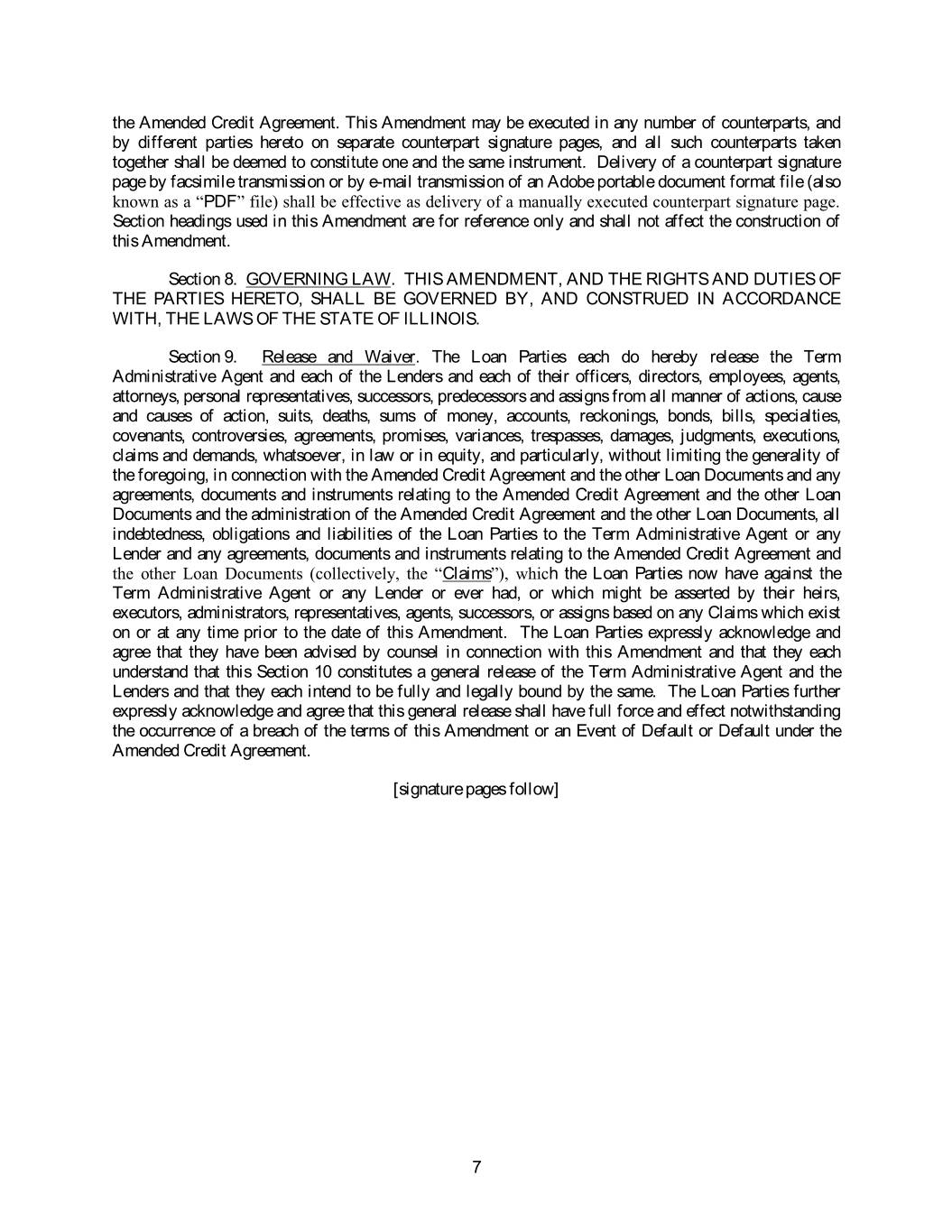 the Amended Credit Agreement. This Amendment may be executed in any number of counterparts, and by different parties hereto on separate counterpart signature pages, and all such counterparts taken together shall be deemed to constitute one and the same instrument. Delivery of a counterpart signature page by facsimile transmission or by e-mail transmission of an Adobe portable document format file (also known as a “PDF” file) shall be effective as delivery of a manually executed counterpart signature page. Section headings used in this Amendment are for reference only and shall not affect the construction of this Amendment. Section 8. GOVERNING LAW. THIS AMENDMENT, AND THE RIGHTS AND DUTIES OF THE PARTIES HERETO, SHALL BE GOVERNED BY, AND CONSTRUED IN ACCORDANCE WITH, THE LAWS OF THE STATE OF ILLINOIS. Section 9. Release and Waiver. The Loan Parties each do hereby release the Term Administrative Agent and each of the Lenders and each of their officers, directors, employees, agents, attorneys, personal representatives, successors, predecessors and assigns from all manner of actions, cause and causes of action, suits, deaths, sums of money, accounts, reckonings, bonds, bills, specialties, covenants, controversies, agreements, promises, variances, trespasses, damages, judgments, executions, claims and demands, whatsoever, in law or in equity, and particularly, without limiting the generality of the foregoing, in connection with the Amended Credit Agreement and the other Loan Documents and any agreements, documents and instruments relating to the Amended Credit Agreement and the other Loan Documents and the administration of the Amended Credit Agreement and the other Loan Documents, all indebtedness, obligations and liabilities of the Loan Parties to the Term Administrative Agent or any Lender and any agreements, documents and instruments relating to the Amended Credit Agreement and the other Loan Documents (collectively, the “Claims”), which the Loan Parties now have against the Term Administrative Agent or any Lender or ever had, or which might be asserted by their heirs, executors, administrators, representatives, agents, successors, or assigns based on any Claims which exist on or at any time prior to the date of this Amendment. The Loan Parties expressly acknowledge and agree that they have been advised by counsel in connection with this Amendment and that they each understand that this Section 10 constitutes a general release of the Term Administrative Agent and the Lenders and that they each intend to be fully and legally bound by the same. The Loan Parties further expressly acknowledge and agree that this general release shall have full force and effect notwithstanding the occurrence of a breach of the terms of this Amendment or an Event of Default or Default under the Amended Credit Agreement. [signature pages follow] 7