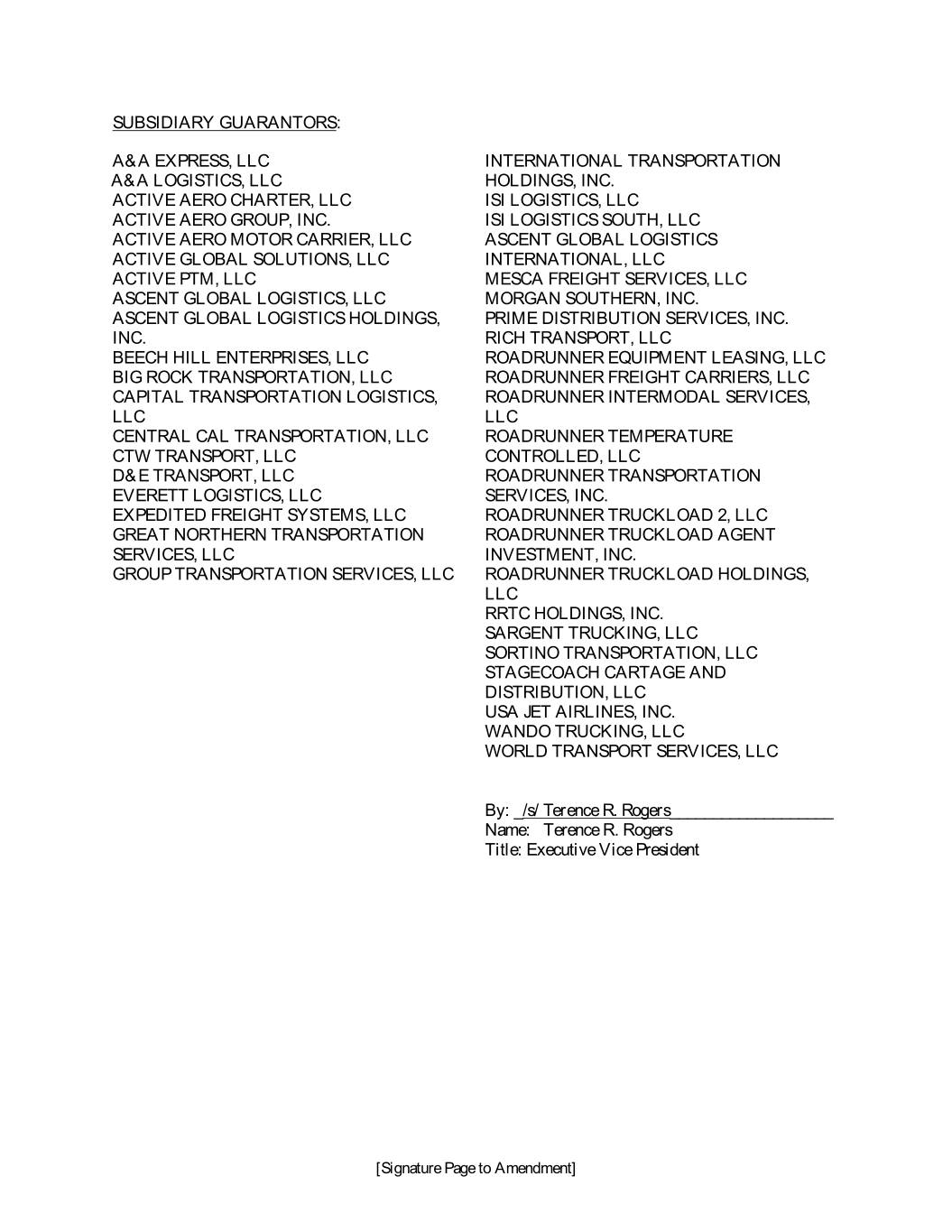 SUBSIDIARY GUARANTORS: A&A EXPRESS, LLC INTERNATIONAL TRANSPORTATION A&A LOGISTICS, LLC HOLDINGS, INC. ACTIVE AERO CHARTER, LLC ISI LOGISTICS, LLC ACTIVE AERO GROUP, INC. ISI LOGISTICS SOUTH, LLC ACTIVE AERO MOTOR CARRIER, LLC ASCENT GLOBAL LOGISTICS ACTIVE GLOBAL SOLUTIONS, LLC INTERNATIONAL, LLC ACTIVE PTM, LLC MESCA FREIGHT SERVICES, LLC ASCENT GLOBAL LOGISTICS, LLC MORGAN SOUTHERN, INC. ASCENT GLOBAL LOGISTICS HOLDINGS, PRIME DISTRIBUTION SERVICES, INC. INC. RICH TRANSPORT, LLC BEECH HILL ENTERPRISES, LLC ROADRUNNER EQUIPMENT LEASING, LLC BIG ROCK TRANSPORTATION, LLC ROADRUNNER FREIGHT CARRIERS, LLC CAPITAL TRANSPORTATION LOGISTICS, ROADRUNNER INTERMODAL SERVICES, LLC LLC CENTRAL CAL TRANSPORTATION, LLC ROADRUNNER TEMPERATURE CTW TRANSPORT, LLC CONTROLLED, LLC D&E TRANSPORT, LLC ROADRUNNER TRANSPORTATION EVERETT LOGISTICS, LLC SERVICES, INC. EXPEDITED FREIGHT SYSTEMS, LLC ROADRUNNER TRUCKLOAD 2, LLC GREAT NORTHERN TRANSPORTATION ROADRUNNER TRUCKLOAD AGENT SERVICES, LLC INVESTMENT, INC. GROUP TRANSPORTATION SERVICES, LLC ROADRUNNER TRUCKLOAD HOLDINGS, LLC RRTC HOLDINGS, INC. SARGENT TRUCKING, LLC SORTINO TRANSPORTATION, LLC STAGECOACH CARTAGE AND DISTRIBUTION, LLC USA JET AIRLINES, INC. WANDO TRUCKING, LLC WORLD TRANSPORT SERVICES, LLC By: _/s/ Terence R. Rogers___________________ Name: Terence R. Rogers Title: Executive Vice President [Signature Page to Amendment]