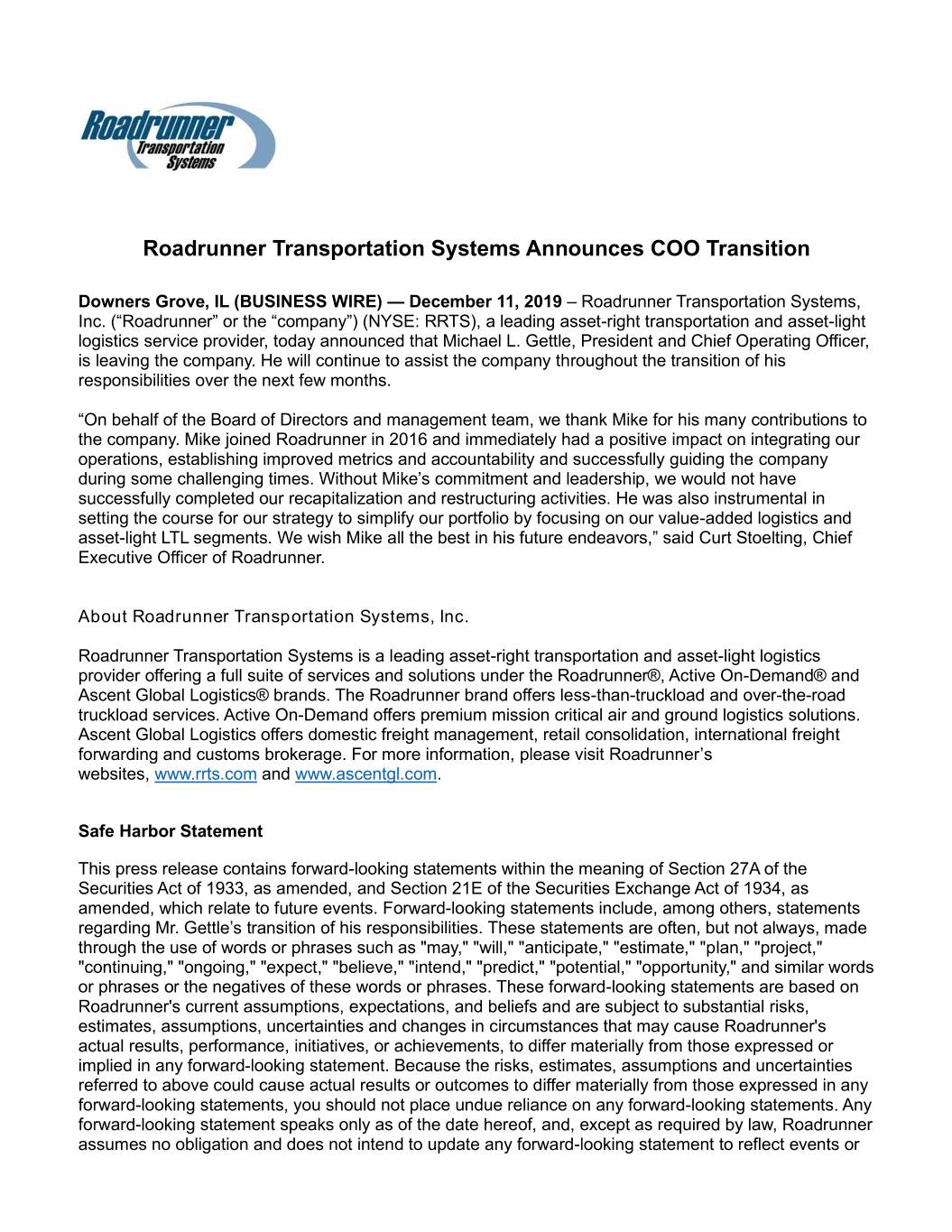 Roadrunner Transportation Systems Announces COO Transition Downers Grove, IL (BUSINESS WIRE) — December 11, 2019 – Roadrunner Transportation Systems, Inc. (“Roadrunner” or the “company”) (NYSE: RRTS), a leading asset-right transportation and asset-light logistics service provider, today announced that Michael L. Gettle, President and Chief Operating Officer, is leaving the company. He will continue to assist the company throughout the transition of his responsibilities over the next few months. “On behalf of the Board of Directors and management team, we thank Mike for his many contributions to the company. Mike joined Roadrunner in 2016 and immediately had a positive impact on integrating our operations, establishing improved metrics and accountability and successfully guiding the company during some challenging times. Without Mike’s commitment and leadership, we would not have successfully completed our recapitalization and restructuring activities. He was also instrumental in setting the course for our strategy to simplify our portfolio by focusing on our value-added logistics and asset-light LTL segments. We wish Mike all the best in his future endeavors,” said Curt Stoelting, Chief Executive Officer of Roadrunner. About Roadrunner Transportation Systems, Inc. Roadrunner Transportation Systems is a leading asset-right transportation and asset-light logistics provider offering a full suite of services and solutions under the Roadrunner®, Active On-Demand® and Ascent Global Logistics® brands. The Roadrunner brand offers less-than-truckload and over-the-road truckload services. Active On-Demand offers premium mission critical air and ground logistics solutions. Ascent Global Logistics offers domestic freight management, retail consolidation, international freight forwarding and customs brokerage. For more information, please visit Roadrunner’s websites, www.rrts.com and www.ascentgl.com. Safe Harbor Statement This press release contains forward-looking statements within the meaning of Section 27A of the Securities Act of 1933, as amended, and Section 21E of the Securities Exchange Act of 1934, as amended, which relate to future events. Forward-looking statements include, among others, statements regarding Mr. Gettle’s transition of his responsibilities. These statements are often, but not always, made through the use of words or phrases such as "may," "will," "anticipate," "estimate," "plan," "project," "continuing," "ongoing," "expect," "believe," "intend," "predict," "potential," "opportunity," and similar words or phrases or the negatives of these words or phrases. These forward-looking statements are based on Roadrunner's current assumptions, expectations, and beliefs and are subject to substantial risks, estimates, assumptions, uncertainties and changes in circumstances that may cause Roadrunner's actual results, performance, initiatives, or achievements, to differ materially from those expressed or implied in any forward-looking statement. Because the risks, estimates, assumptions and uncertainties referred to above could cause actual results or outcomes to differ materially from those expressed in any forward-looking statements, you should not place undue reliance on any forward-looking statements. Any forward-looking statement speaks only as of the date hereof, and, except as required by law, Roadrunner assumes no obligation and does not intend to update any forward-looking statement to reflect events or