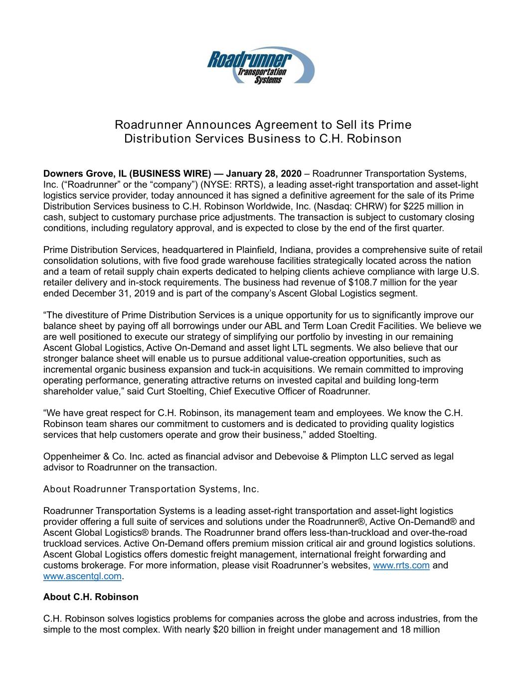 Roadrunner Announces Agreement to Sell its Prime Distribution Services Business to C.H. Robinson Downers Grove, IL (BUSINESS WIRE) — January 28, 2020 – Roadrunner Transportation Systems, Inc. (“Roadrunner” or the “company”) (NYSE: RRTS), a leading asset-right transportation and asset-light logistics service provider, today announced it has signed a definitive agreement for the sale of its Prime Distribution Services business to C.H. Robinson Worldwide, Inc. (Nasdaq: CHRW) for $225 million in cash, subject to customary purchase price adjustments. The transaction is subject to customary closing conditions, including regulatory approval, and is expected to close by the end of the first quarter. Prime Distribution Services, headquartered in Plainfield, Indiana, provides a comprehensive suite of retail consolidation solutions, with five food grade warehouse facilities strategically located across the nation and a team of retail supply chain experts dedicated to helping clients achieve compliance with large U.S. retailer delivery and in-stock requirements. The business had revenue of $108.7 million for the year ended December 31, 2019 and is part of the company’s Ascent Global Logistics segment. “The divestiture of Prime Distribution Services is a unique opportunity for us to significantly improve our balance sheet by paying off all borrowings under our ABL and Term Loan Credit Facilities. We believe we are well positioned to execute our strategy of simplifying our portfolio by investing in our remaining Ascent Global Logistics, Active On-Demand and asset light LTL segments. We also believe that our stronger balance sheet will enable us to pursue additional value-creation opportunities, such as incremental organic business expansion and tuck-in acquisitions. We remain committed to improving operating performance, generating attractive returns on invested capital and building long-term shareholder value,” said Curt Stoelting, Chief Executive Officer of Roadrunner. “We have great respect for C.H. Robinson, its management team and employees. We know the C.H. Robinson team shares our commitment to customers and is dedicated to providing quality logistics services that help customers operate and grow their business,” added Stoelting. Oppenheimer & Co. Inc. acted as financial advisor and Debevoise & Plimpton LLC served as legal advisor to Roadrunner on the transaction. About Roadrunner Transportation Systems, Inc. Roadrunner Transportation Systems is a leading asset-right transportation and asset-light logistics provider offering a full suite of services and solutions under the Roadrunner®, Active On-Demand® and Ascent Global Logistics® brands. The Roadrunner brand offers less-than-truckload and over-the-road truckload services. Active On-Demand offers premium mission critical air and ground logistics solutions. Ascent Global Logistics offers domestic freight management, international freight forwarding and customs brokerage. For more information, please visit Roadrunner’s websites, www.rrts.com and www.ascentgl.com. About C.H. Robinson C.H. Robinson solves logistics problems for companies across the globe and across industries, from the simple to the most complex. With nearly $20 billion in freight under management and 18 million