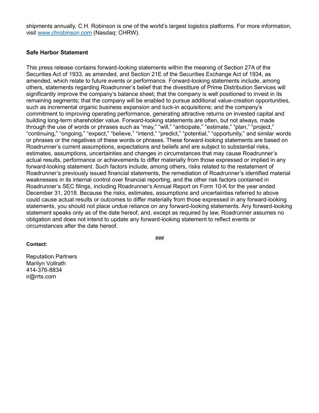 shipments annually, C.H. Robinson is one of the world’s largest logistics platforms. For more information, visit www.chrobinson.com (Nasdaq: CHRW). Safe Harbor Statement This press release contains forward-looking statements within the meaning of Section 27A of the Securities Act of 1933, as amended, and Section 21E of the Securities Exchange Act of 1934, as amended, which relate to future events or performance. Forward-looking statements include, among others, statements regarding Roadrunner’s belief that the divestiture of Prime Distribution Services will significantly improve the company’s balance sheet; that the company is well positioned to invest in its remaining segments; that the company will be enabled to pursue additional value-creation opportunities, such as incremental organic business expansion and tuck-in acquisitions; and the company’s commitment to improving operating performance, generating attractive returns on invested capital and building long-term shareholder value. Forward-looking statements are often, but not always, made through the use of words or phrases such as “may,” “will,” “anticipate,” “estimate,” “plan,” “project,” “continuing,” “ongoing,” “expect,” “believe,” “intend,” “predict,” “potential,” “opportunity,” and similar words or phrases or the negatives of these words or phrases. These forward-looking statements are based on Roadrunner’s current assumptions, expectations and beliefs and are subject to substantial risks, estimates, assumptions, uncertainties and changes in circumstances that may cause Roadrunner’s actual results, performance or achievements to differ materially from those expressed or implied in any forward-looking statement. Such factors include, among others, risks related to the restatement of Roadrunner’s previously issued financial statements, the remediation of Roadrunner’s identified material weaknesses in its internal control over financial reporting, and the other risk factors contained in Roadrunner’s SEC filings, including Roadrunner’s Annual Report on Form 10-K for the year ended December 31, 2018. Because the risks, estimates, assumptions and uncertainties referred to above could cause actual results or outcomes to differ materially from those expressed in any forward-looking statements, you should not place undue reliance on any forward-looking statements. Any forward-looking statement speaks only as of the date hereof, and, except as required by law, Roadrunner assumes no obligation and does not intend to update any forward-looking statement to reflect events or circumstances after the date hereof. ### Contact: Reputation Partners Marilyn Vollrath 414-376-8834 ir@rrts.com