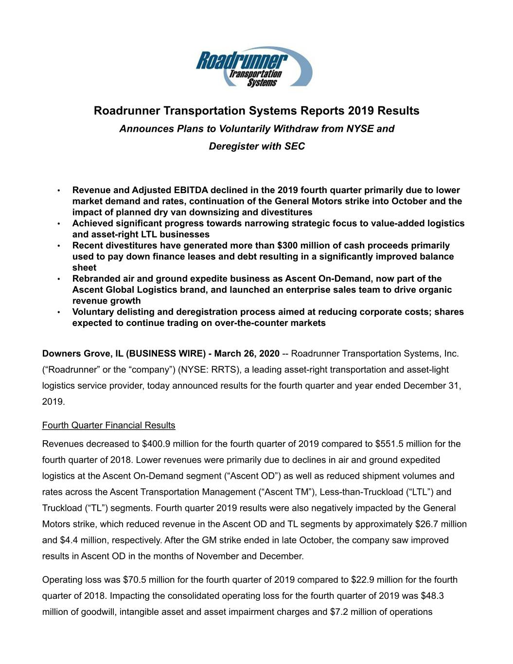 Roadrunner Transportation Systems Reports 2019 Results Announces Plans to Voluntarily Withdraw from NYSE and Deregister with SEC • Revenue and Adjusted EBITDA declined in the 2019 fourth quarter primarily due to lower market demand and rates, continuation of the General Motors strike into October and the impact of planned dry van downsizing and divestitures • Achieved significant progress towards narrowing strategic focus to value-added logistics and asset-right LTL businesses • Recent divestitures have generated more than $300 million of cash proceeds primarily used to pay down finance leases and debt resulting in a significantly improved balance sheet • Rebranded air and ground expedite business as Ascent On-Demand, now part of the Ascent Global Logistics brand, and launched an enterprise sales team to drive organic revenue growth • Voluntary delisting and deregistration process aimed at reducing corporate costs; shares expected to continue trading on over-the-counter markets Downers Grove, IL (BUSINESS WIRE) - March 26, 2020 -- Roadrunner Transportation Systems, Inc. (“Roadrunner” or the “company”) (NYSE: RRTS), a leading asset-right transportation and asset-light logistics service provider, today announced results for the fourth quarter and year ended December 31, 2019. Fourth Quarter Financial Results Revenues decreased to $400.9 million for the fourth quarter of 2019 compared to $551.5 million for the fourth quarter of 2018. Lower revenues were primarily due to declines in air and ground expedited logistics at the Ascent On-Demand segment (“Ascent OD”) as well as reduced shipment volumes and rates across the Ascent Transportation Management (“Ascent TM”), Less-than-Truckload (“LTL”) and Truckload (“TL”) segments. Fourth quarter 2019 results were also negatively impacted by the General Motors strike, which reduced revenue in the Ascent OD and TL segments by approximately $26.7 million and $4.4 million, respectively. After the GM strike ended in late October, the company saw improved results in Ascent OD in the months of November and December. Operating loss was $70.5 million for the fourth quarter of 2019 compared to $22.9 million for the fourth quarter of 2018. Impacting the consolidated operating loss for the fourth quarter of 2019 was $48.3 million of goodwill, intangible asset and asset impairment charges and $7.2 million of operations