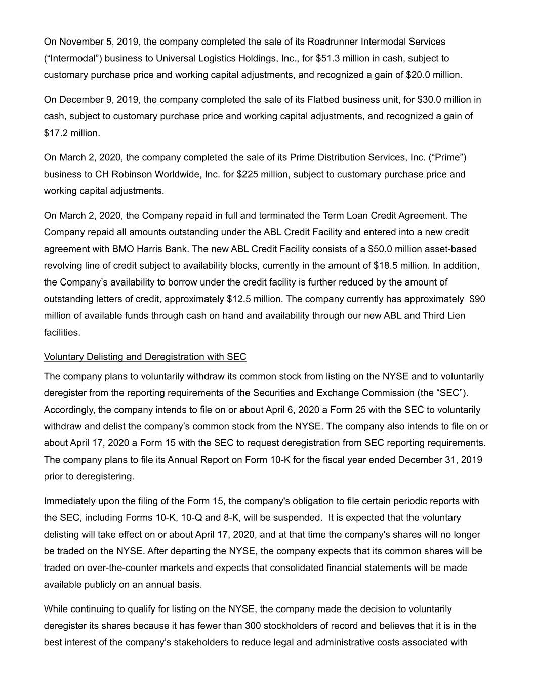 On November 5, 2019, the company completed the sale of its Roadrunner Intermodal Services (“Intermodal”) business to Universal Logistics Holdings, Inc., for $51.3 million in cash, subject to customary purchase price and working capital adjustments, and recognized a gain of $20.0 million. On December 9, 2019, the company completed the sale of its Flatbed business unit, for $30.0 million in cash, subject to customary purchase price and working capital adjustments, and recognized a gain of $17.2 million. On March 2, 2020, the company completed the sale of its Prime Distribution Services, Inc. (“Prime”) business to CH Robinson Worldwide, Inc. for $225 million, subject to customary purchase price and working capital adjustments. On March 2, 2020, the Company repaid in full and terminated the Term Loan Credit Agreement. The Company repaid all amounts outstanding under the ABL Credit Facility and entered into a new credit agreement with BMO Harris Bank. The new ABL Credit Facility consists of a $50.0 million asset-based revolving line of credit subject to availability blocks, currently in the amount of $18.5 million. In addition, the Company’s availability to borrow under the credit facility is further reduced by the amount of outstanding letters of credit, approximately $12.5 million. The company currently has approximately $90 million of available funds through cash on hand and availability through our new ABL and Third Lien facilities. Voluntary Delisting and Deregistration with SEC The company plans to voluntarily withdraw its common stock from listing on the NYSE and to voluntarily deregister from the reporting requirements of the Securities and Exchange Commission (the “SEC”). Accordingly, the company intends to file on or about April 6, 2020 a Form 25 with the SEC to voluntarily withdraw and delist the company’s common stock from the NYSE. The company also intends to file on or about April 17, 2020 a Form 15 with the SEC to request deregistration from SEC reporting requirements. The company plans to file its Annual Report on Form 10-K for the fiscal year ended December 31, 2019 prior to deregistering. Immediately upon the filing of the Form 15, the company's obligation to file certain periodic reports with the SEC, including Forms 10-K, 10-Q and 8-K, will be suspended. It is expected that the voluntary delisting will take effect on or about April 17, 2020, and at that time the company's shares will no longer be traded on the NYSE. After departing the NYSE, the company expects that its common shares will be traded on over-the-counter markets and expects that consolidated financial statements will be made available publicly on an annual basis. While continuing to qualify for listing on the NYSE, the company made the decision to voluntarily deregister its shares because it has fewer than 300 stockholders of record and believes that it is in the best interest of the company’s stakeholders to reduce legal and administrative costs associated with