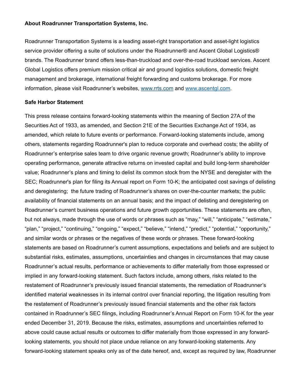 About Roadrunner Transportation Systems, Inc. Roadrunner Transportation Systems is a leading asset-right transportation and asset-light logistics service provider offering a suite of solutions under the Roadrunner® and Ascent Global Logistics® brands. The Roadrunner brand offers less-than-truckload and over-the-road truckload services. Ascent Global Logistics offers premium mission critical air and ground logistics solutions, domestic freight management and brokerage, international freight forwarding and customs brokerage. For more information, please visit Roadrunner’s websites, www.rrts.com and www.ascentgl.com. Safe Harbor Statement This press release contains forward-looking statements within the meaning of Section 27A of the Securities Act of 1933, as amended, and Section 21E of the Securities Exchange Act of 1934, as amended, which relate to future events or performance. Forward-looking statements include, among others, statements regarding Roadrunner's plan to reduce corporate and overhead costs; the ability of Roadrunner’s enterprise sales team to drive organic revenue growth; Roadrunner’s ability to improve operating performance, generate attractive returns on invested capital and build long-term shareholder value; Roadrunner’s plans and timing to delist its common stock from the NYSE and deregister with the SEC; Roadrunner's plan for filing its Annual report on Form 10-K; the anticipated cost savings of delisting and deregistering; the future trading of Roadrunner’s shares on over-the-counter markets; the public availability of financial statements on an annual basis; and the impact of delisting and deregistering on Roadrunner’s current business operations and future growth opportunities. These statements are often, but not always, made through the use of words or phrases such as “may,” “will,” “anticipate,” “estimate,” “plan,” “project,” “continuing,” “ongoing,” “expect,” “believe,” “intend,” “predict,” “potential,” “opportunity,” and similar words or phrases or the negatives of these words or phrases. These forward-looking statements are based on Roadrunner’s current assumptions, expectations and beliefs and are subject to substantial risks, estimates, assumptions, uncertainties and changes in circumstances that may cause Roadrunner’s actual results, performance or achievements to differ materially from those expressed or implied in any forward-looking statement. Such factors include, among others, risks related to the restatement of Roadrunner’s previously issued financial statements, the remediation of Roadrunner’s identified material weaknesses in its internal control over financial reporting, the litigation resulting from the restatement of Roadrunner’s previously issued financial statements and the other risk factors contained in Roadrunner’s SEC filings, including Roadrunner’s Annual Report on Form 10-K for the year ended December 31, 2019. Because the risks, estimates, assumptions and uncertainties referred to above could cause actual results or outcomes to differ materially from those expressed in any forward- looking statements, you should not place undue reliance on any forward-looking statements. Any forward-looking statement speaks only as of the date hereof, and, except as required by law, Roadrunner