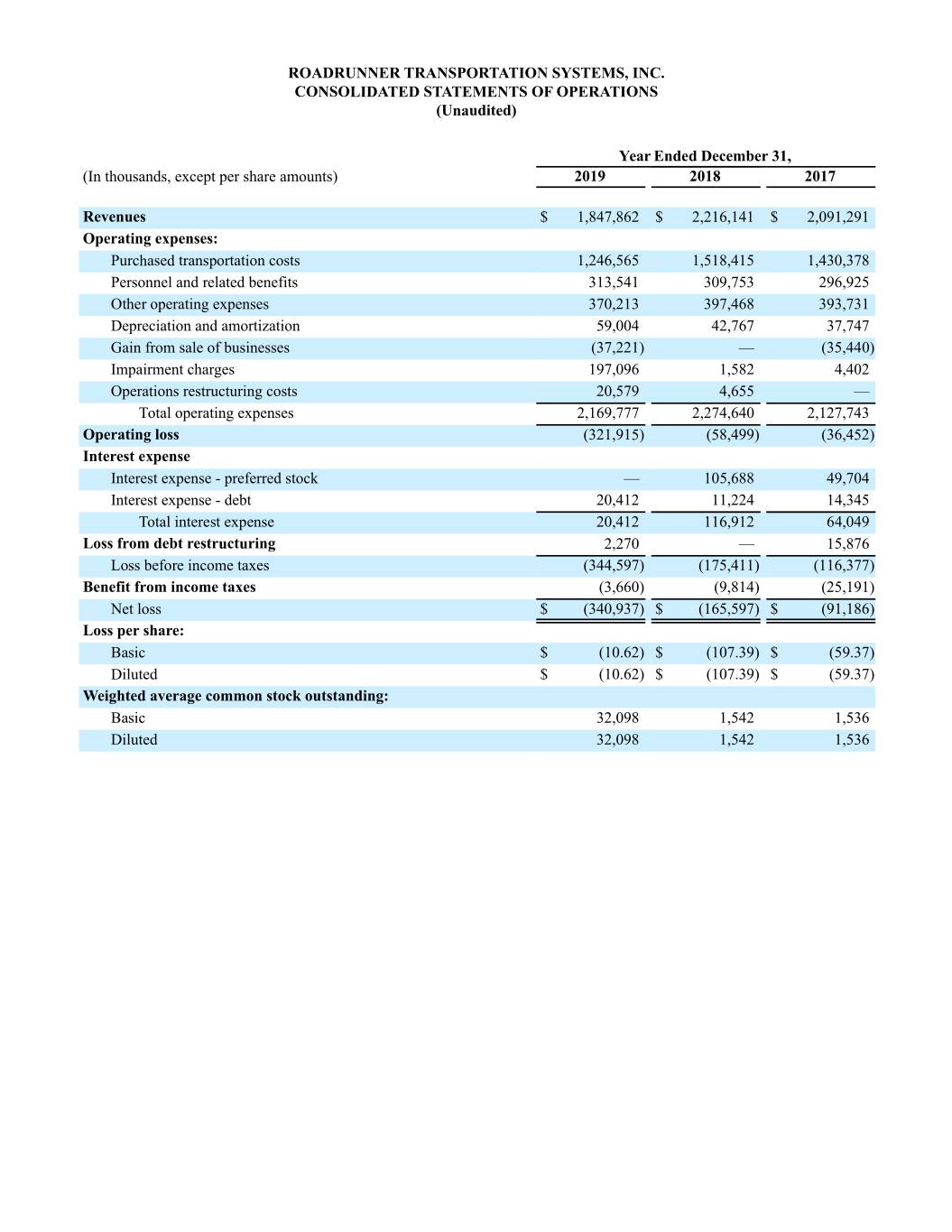 ROADRUNNER TRANSPORTATION SYSTEMS, INC. CONSOLIDATED STATEMENTS OF OPERATIONS (Unaudited) Year Ended December 31, (In thousands, except per share amounts) 2019 2018 2017 Revenues $ 1,847,862 $ 2,216,141 $ 2,091,291 Operating expenses: Purchased transportation costs 1,246,565 1,518,415 1,430,378 Personnel and related benefits 313,541 309,753 296,925 Other operating expenses 370,213 397,468 393,731 Depreciation and amortization 59,004 42,767 37,747 Gain from sale of businesses (37,221) — (35,440) Impairment charges 197,096 1,582 4,402 Operations restructuring costs 20,579 4,655 — Total operating expenses 2,169,777 2,274,640 2,127,743 Operating loss (321,915) (58,499) (36,452) Interest expense Interest expense - preferred stock — 105,688 49,704 Interest expense - debt 20,412 11,224 14,345 Total interest expense 20,412 116,912 64,049 Loss from debt restructuring 2,270 — 15,876 Loss before income taxes (344,597) (175,411) (116,377) Benefit from income taxes (3,660) (9,814) (25,191) Net loss $ (340,937) $ (165,597) $ (91,186) Loss per share: Basic $ (10.62) $ (107.39) $ (59.37) Diluted $ (10.62) $ (107.39) $ (59.37) Weighted average common stock outstanding: Basic 32,098 1,542 1,536 Diluted 32,098 1,542 1,536