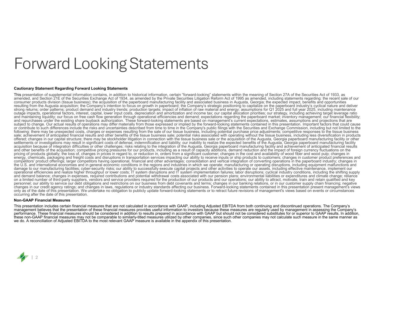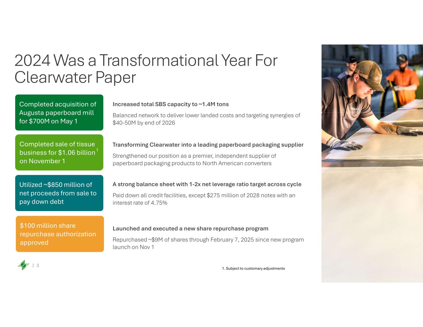 2 Forward Looking Statements Cautionary Statement Regarding Forward Looking Statements This presentation of supplemental information contains, in addition to historical information, certain “forward-looking” statements within the meaning of Section 27A of the Securities Act of 1933, as amended, and Section 21E of the Securities Exchange Act of 1934, as amended by the Private Securities Litigation Reform Act of 1995 as amended, including statements regarding: the recent sale of our consumer products division (tissue business); the acquisition of the paperboard manufacturing facility and associated business in Augusta, Georgia; the expected impact, benefits and opportunities resulting from the Augusta acquisition; the Company’s intention to focus on growth in paperboard; the Company’s strategic positioning to capitalize on the paperboard industry’s cyclical nature and deliver strong returns; order patterns; product demand and industry trends; production targets; impact of inflation of raw material and energy; assumptions for Q1 2025 and full year 2025, including maintenance outage impacts, operational factors, interest, capital, lower input costs, depreciation and amortization and income tax; our capital allocation priorities; our strategy, including achieving target leverage ratio and maintaining liquidity; our focus on free cash flow generation through operational efficiencies and demand; expectations regarding the paperboard market; inventory management; our financial flexibility; and repurchases under the existing share buyback authorization. These forward-looking statements are based on management’s current expectations, estimates, assumptions and projections that are subject to change. Our actual results of operations may differ materially from those expressed or implied by the forward-looking statements contained in this presentation. Important factors that could cause or contribute to such differences include the risks and uncertainties described from time to time in the Company's public filings with the Securities and Exchange Commission, including but not limited to the following: there may be unexpected costs, charges or expenses resulting from the sale of our tissue business, including potential purchase price adjustments; competitive responses to the tissue business sale; achievement of anticipated financial results and other benefits of the tissue business sale; potential risks associated with operating without the tissue business, including less diversification in products offered; changes in our capital structure; there may be stockholder litigation in connection with the tissue business sale or the acquisition of the Augusta, Georgia paperboard manufacturing facility or other settlements or investigations may result in significant costs of defense, indemnification and liability; our inability to realize the expected benefits of the Augusta, Georgia paperboard manufacturing facility acquisition because of integration difficulties or other challenges; risks relating to the integration of the Augusta, Georgia paperboard manufacturing facility and achievement of anticipated financial results and other benefits of the acquisition; competitive pricing pressures for our products, including as a result of capacity additions, demand reduction and the impact of foreign currency fluctuations on the pricing of products globally; the loss of, changes in prices in regard to, or reduction in, orders from a significant customer; changes in the cost and availability of wood fiber and wood pulp; changes in energy, chemicals, packaging and freight costs and disruptions in transportation services impacting our ability to receive inputs or ship products to customers; changes in customer product preferences and competitors' product offerings; larger competitors having operational, financial and other advantages; consolidation and vertical integration of converting operations in the paperboard industry; changes in the U.S. and international economies and in general economic conditions in the regions and industries in which we operate; manufacturing or operating disruptions, including equipment malfunctions and damage to our manufacturing facilities; cyber-security risks; our ability to successfully execute capital projects and other activities to operate our assets, including effective maintenance, implement our operational efficiencies and realize higher throughput or lower costs; IT system disruptions and IT system implementation failures; labor disruptions; cyclical industry conditions, including the shifting supply and demand balance; changes in expenses, required contributions and potential withdrawal costs associated with our pension plans; environmental liabilities or expenditures and climate change; reliance on a limited number of third-party suppliers, vendors and service providers required for the production of our products and our operations; our ability to attract, motivate, train and retain qualified and key personnel; our ability to service our debt obligations and restrictions on our business from debt covenants and terms; changes in our banking relations, or in our customer supply chain financing; negative changes in our credit agency ratings; and changes in laws, regulations or industry standards affecting our business. Forward-looking statements contained in this presentation present management’s views only as of the date of this presentation. We undertake no obligation to publicly update forward-looking statements or to retract future revisions of management's views based on events or circumstances occurring after the date of this presentation. Non-GAAP Financial Measures This presentation includes certain financial measures that are not calculated in accordance with GAAP, including Adjusted EBITDA from both continuing and discontinued operations. The Company’s management believes that the presentation of these financial measures provides useful information to 