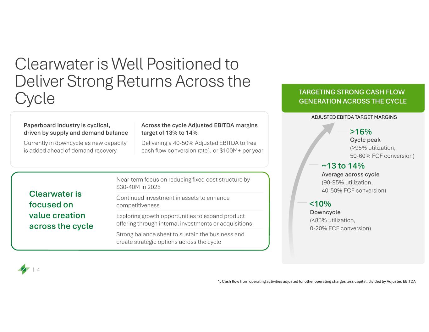3 Utilized ~$850 million of net proceeds from sale to pay down debt Completed sale of tissue business for $1.06 billion on November 1 Completed acquisition of Augusta paperboard mill for $700M on May 1 LIGHTWEIGHT PRODUCTS Increased total SBS capacity to ~1.4M tons Balanced network to deliver lower landed costs and targeting synergies of $40-50M by end of 2026 2024 Was a Transformational Year For Clearwater Paper $100 million share repurchase authorization approved Launched and executed a new share repurchase program Repurchased ~$9M of shares through February 7, 2025 since new program launch on Nov 1 Transforming Clearwater into a leading paperboard packaging supplier Strengthened our position as a premier, independent supplier of paperboard packaging products to North American converters A strong balance sheet with 1-2x net leverage ratio target across cycle Paid down all credit facilities, except $275 million of 2028 notes with an interest rate of 4.75% 1. Subject to customary adjustments 1