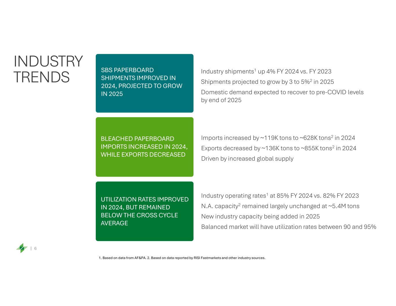 6 INDUSTRY TRENDS 1. Based on data from AF&PA. 2. Based on data reported by RISI Fastmarkets and other industry sources. SBS PAPERBOARD SHIPMENTS IMPROVED IN 2024, PROJECTED TO GROW IN 2025 Industry shipments1 up 4% FY 2024 vs. FY 2023 Shipments projected to grow by 3 to 5%2 in 2025 Domestic demand expected to recover to pre-COVID levels by end of 2025 UTILIZATION RATES IMPROVED IN 2024, BUT REMAINED BELOW THE CROSS CYCLE AVERAGE Industry operating rates1 at 85% FY 2024 vs. 82% FY 2023 N.A. capacity2 remained largely unchanged at ~5.4M tons New industry capacity being added in 2025 Balanced market will have utilization rates between 90 and 95% BLEACHED PAPERBOARD IMPORTS INCREASED IN 2024, WHILE EXPORTS DECREASED Imports increased by ~119K tons to ~628K tons2 in 2024 Exports decreased by ~136K tons to ~855K tons2 in 2024 Driven by increased global supply