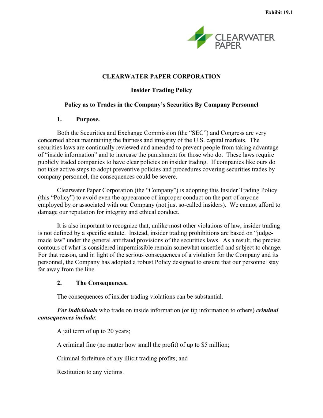 CLEARWATER PAPER CORPORATION Insider Trading Policy Policy as to Trades in the Company’s Securities By Company Personnel 1. Purpose. Both the Securities and Exchange Commission (the “SEC”) and Congress are very concerned about maintaining the fairness and integrity of the U.S. capital markets. The securities laws are continually reviewed and amended to prevent people from taking advantage of “inside information” and to increase the punishment for those who do. These laws require publicly traded companies to have clear policies on insider trading. If companies like ours do not take active steps to adopt preventive policies and procedures covering securities trades by company personnel, the consequences could be severe. Clearwater Paper Corporation (the “Company”) is adopting this Insider Trading Policy (this “Policy”) to avoid even the appearance of improper conduct on the part of anyone employed by or associated with our Company (not just so-called insiders). We cannot afford to damage our reputation for integrity and ethical conduct. It is also important to recognize that, unlike most other violations of law, insider trading is not defined by a specific statute. Instead, insider trading prohibitions are based on “judge- made law” under the general antifraud provisions of the securities laws. As a result, the precise contours of what is considered impermissible remain somewhat unsettled and subject to change. For that reason, and in light of the serious consequences of a violation for the Company and its personnel, the Company has adopted a robust Policy designed to ensure that our personnel stay far away from the line. 2. The Consequences. The consequences of insider trading violations can be substantial. For individuals who trade on inside information (or tip information to others) criminal consequences include: A jail term of up to 20 years; A criminal fine (no matter how small the profit) of up to $5 million; Criminal forfeiture of any illicit trading profits; and Restitution to any victims. Exhibit 19.1