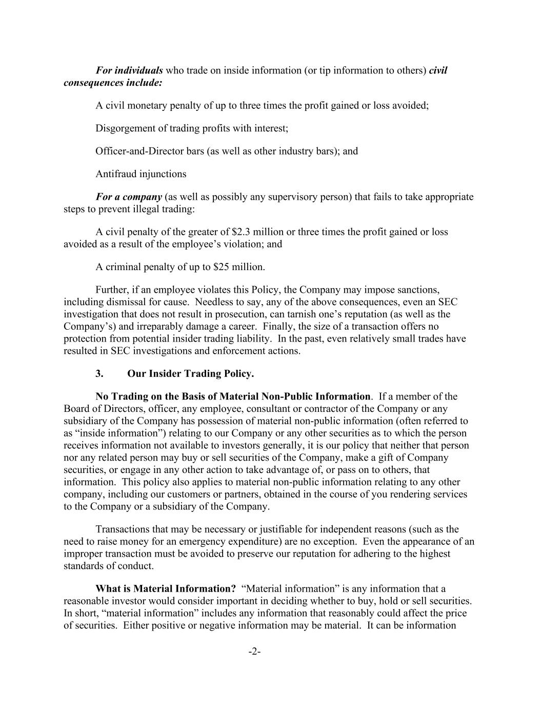 -2- For individuals who trade on inside information (or tip information to others) civil consequences include: A civil monetary penalty of up to three times the profit gained or loss avoided; Disgorgement of trading profits with interest; Officer-and-Director bars (as well as other industry bars); and Antifraud injunctions For a company (as well as possibly any supervisory person) that fails to take appropriate steps to prevent illegal trading: A civil penalty of the greater of $2.3 million or three times the profit gained or loss avoided as a result of the employee’s violation; and A criminal penalty of up to $25 million. Further, if an employee violates this Policy, the Company may impose sanctions, including dismissal for cause. Needless to say, any of the above consequences, even an SEC investigation that does not result in prosecution, can tarnish one’s reputation (as well as the Company’s) and irreparably damage a career. Finally, the size of a transaction offers no protection from potential insider trading liability. In the past, even relatively small trades have resulted in SEC investigations and enforcement actions. 3. Our Insider Trading Policy. No Trading on the Basis of Material Non-Public Information. If a member of the Board of Directors, officer, any employee, consultant or contractor of the Company or any subsidiary of the Company has possession of material non-public information (often referred to as “inside information”) relating to our Company or any other securities as to which the person receives information not available to investors generally, it is our policy that neither that person nor any related person may buy or sell securities of the Company, make a gift of Company securities, or engage in any other action to take advantage of, or pass on to others, that information. This policy also applies to material non-public information relating to any other company, including our customers or partners, obtained in the course of you rendering services to the Company or a subsidiary of the Company. Transactions that may be necessary or justifiable for independent reasons (such as the need to raise money for an emergency expenditure) are no exception. Even the appearance of an improper transaction must be avoided to preserve our reputation for adhering to the highest standards of conduct. What is Material Information? “Material information” is any information that a reasonable investor would consider important in deciding whether to buy, hold or sell securities. In short, “material information” includes any information that reasonably could affect the price of securities. Either positive or negative information may be material. It can be information