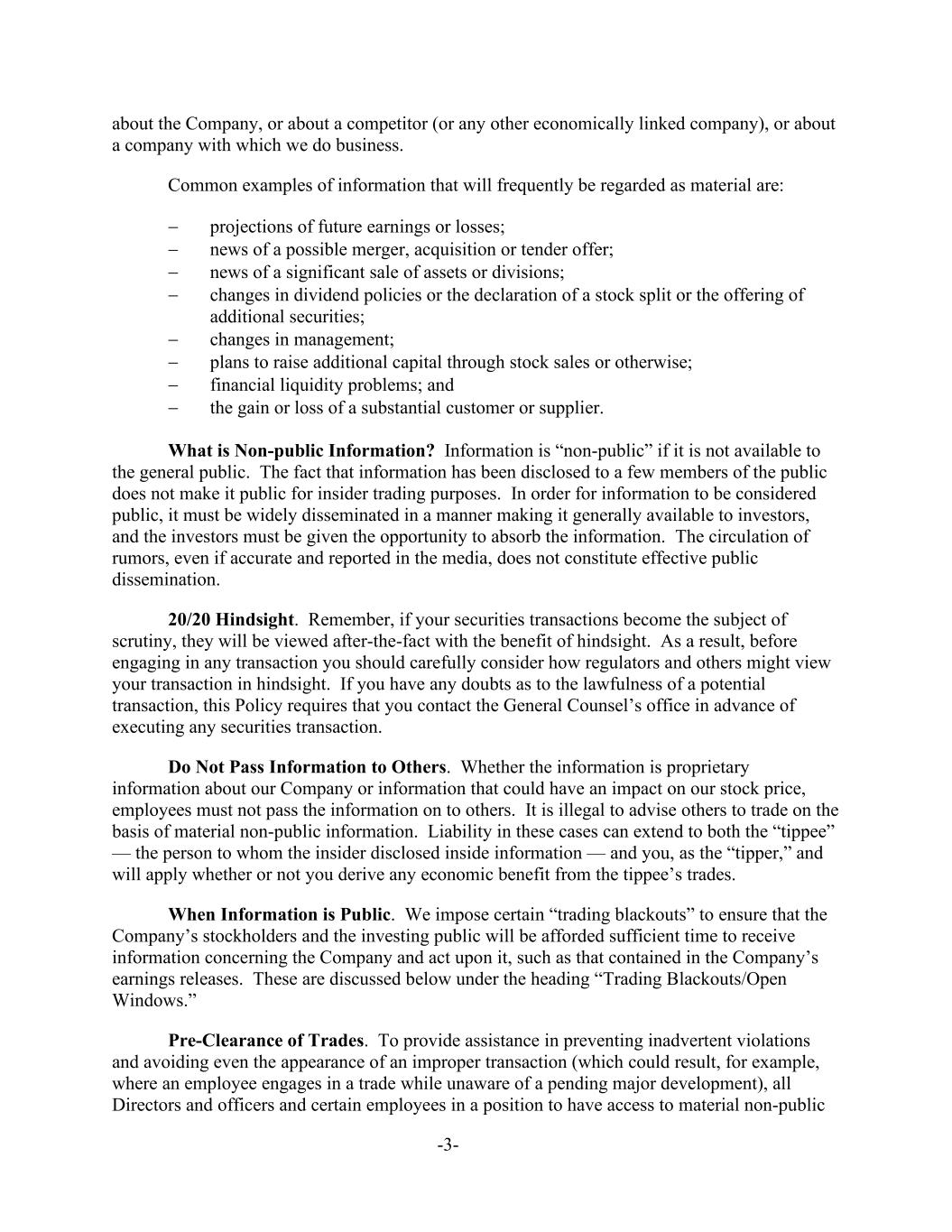 -3- about the Company, or about a competitor (or any other economically linked company), or about a company with which we do business. Common examples of information that will frequently be regarded as material are: − projections of future earnings or losses; − news of a possible merger, acquisition or tender offer; − news of a significant sale of assets or divisions; − changes in dividend policies or the declaration of a stock split or the offering of additional securities; − changes in management; − plans to raise additional capital through stock sales or otherwise; − financial liquidity problems; and − the gain or loss of a substantial customer or supplier. What is Non-public Information? Information is “non-public” if it is not available to the general public. The fact that information has been disclosed to a few members of the public does not make it public for insider trading purposes. In order for information to be considered public, it must be widely disseminated in a manner making it generally available to investors, and the investors must be given the opportunity to absorb the information. The circulation of rumors, even if accurate and reported in the media, does not constitute effective public dissemination. 20/20 Hindsight. Remember, if your securities transactions become the subject of scrutiny, they will be viewed after-the-fact with the benefit of hindsight. As a result, before engaging in any transaction you should carefully consider how regulators and others might view your transaction in hindsight. If you have any doubts as to the lawfulness of a potential transaction, this Policy requires that you contact the General Counsel’s office in advance of executing any securities transaction. Do Not Pass Information to Others. Whether the information is proprietary information about our Company or information that could have an impact on our stock price, employees must not pass the information on to others. It is illegal to advise others to trade on the basis of material non-public information. Liability in these cases can extend to both the “tippee” — the person to whom the insider disclosed inside information — and you, as the “tipper,” and will apply whether or not you derive any economic benefit from the tippee’s trades. When Information is Public. We impose certain “trading blackouts” to ensure that the Company’s stockholders and the investing public will be afforded sufficient time to receive information concerning the Company and act upon it, such as that contained in the Company’s earnings releases. These are discussed below under the heading “Trading Blackouts/Open Windows.” Pre-Clearance of Trades. To provide assistance in preventing inadvertent violations and avoiding even the appearance of an improper transaction (which could result, for example, where an employee engages in a trade while unaware of a pending major development), all Directors and officers and certain employees in a position to have access to material non-public