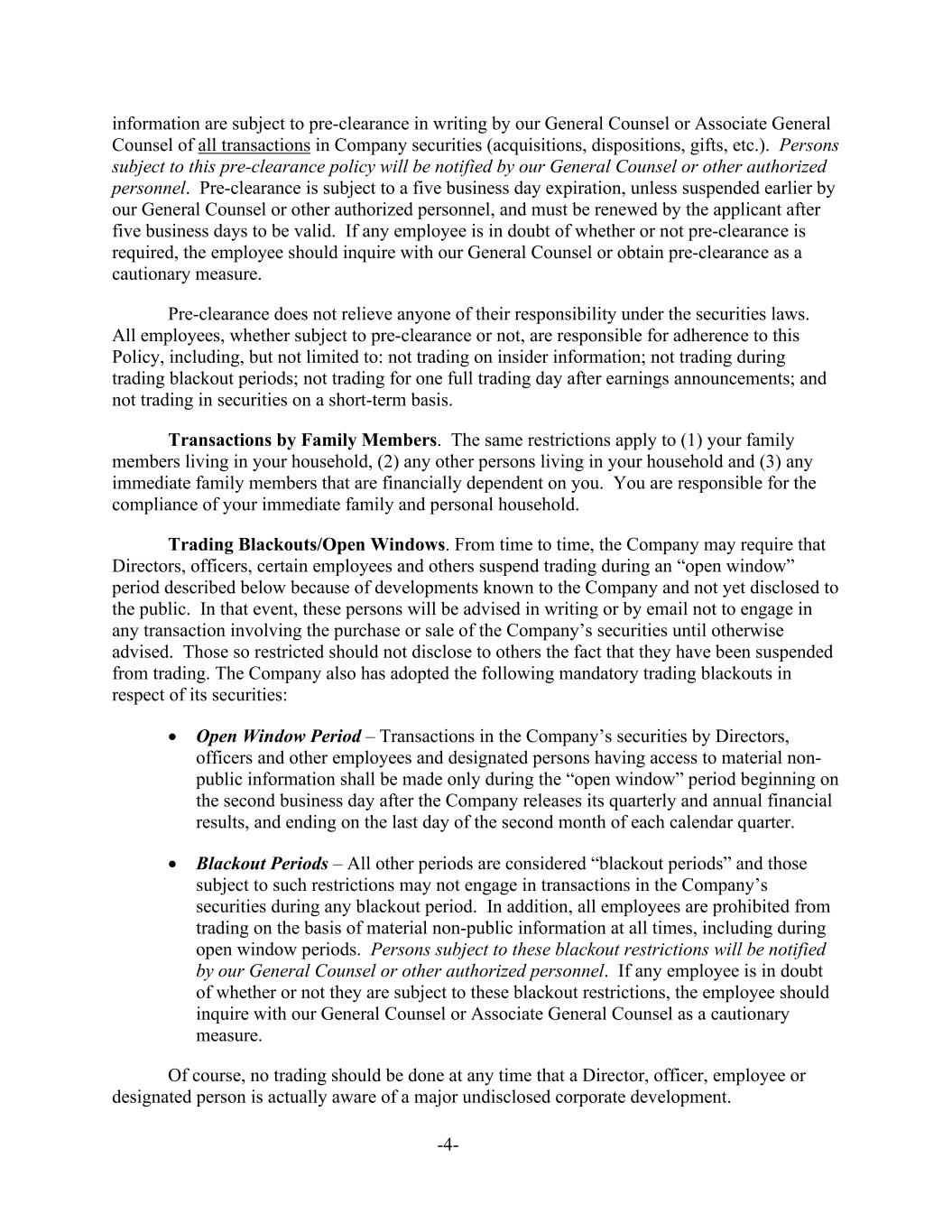 -4- information are subject to pre-clearance in writing by our General Counsel or Associate General Counsel of all transactions in Company securities (acquisitions, dispositions, gifts, etc.). Persons subject to this pre-clearance policy will be notified by our General Counsel or other authorized personnel. Pre-clearance is subject to a five business day expiration, unless suspended earlier by our General Counsel or other authorized personnel, and must be renewed by the applicant after five business days to be valid. If any employee is in doubt of whether or not pre-clearance is required, the employee should inquire with our General Counsel or obtain pre-clearance as a cautionary measure. Pre-clearance does not relieve anyone of their responsibility under the securities laws. All employees, whether subject to pre-clearance or not, are responsible for adherence to this Policy, including, but not limited to: not trading on insider information; not trading during trading blackout periods; not trading for one full trading day after earnings announcements; and not trading in securities on a short-term basis. Transactions by Family Members. The same restrictions apply to (1) your family members living in your household, (2) any other persons living in your household and (3) any immediate family members that are financially dependent on you. You are responsible for the compliance of your immediate family and personal household. Trading Blackouts/Open Windows. From time to time, the Company may require that Directors, officers, certain employees and others suspend trading during an “open window” period described below because of developments known to the Company and not yet disclosed to the public. In that event, these persons will be advised in writing or by email not to engage in any transaction involving the purchase or sale of the Company’s securities until otherwise advised. Those so restricted should not disclose to others the fact that they have been suspended from trading. The Company also has adopted the following mandatory trading blackouts in respect of its securities: • Open Window Period – Transactions in the Company’s securities by Directors, officers and other employees and designated persons having access to material non- public information shall be made only during the “open window” period beginning on the second business day after the Company releases its quarterly and annual financial results, and ending on the last day of the second month of each calendar quarter. • Blackout Periods – All other periods are considered “blackout periods” and those subject to such restrictions may not engage in transactions in the Company’s securities during any blackout period. In addition, all employees are prohibited from trading on the basis of material non-public information at all times, including during open window periods. Persons subject to these blackout restrictions will be notified by our General Counsel or other authorized personnel. If any employee is in doubt of whether or not they are subject to these blackout restrictions, the employee should inquire with our General Counsel or Associate General Counsel as a cautionary measure. Of course, no trading should be done at any time that a Director, officer, employee or designated person is actually aware of a major undisclosed corporate development.