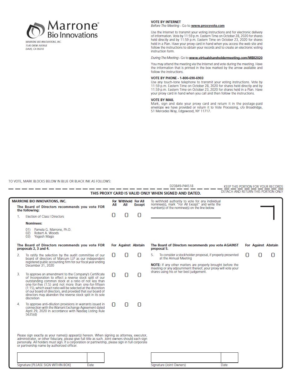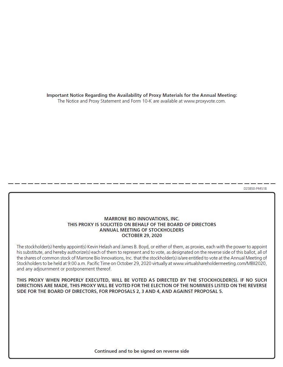 You are cordially invited to attend the 2020 annual meeting of stockholders of Marrone Bio Innovations, Inc., a Delaware corporation. The meeting will be held on October 29, 2020 at 9:00 a.m. Pacific time. The Annual Meeting will be a virtual meeting of stockholders conducted online by live audio webcast. You will be able to attend the virtual meeting, vote your shares electronically and submit questions during the meeting by visiting www.virtualshareholdermeeting.com/MBII2020.