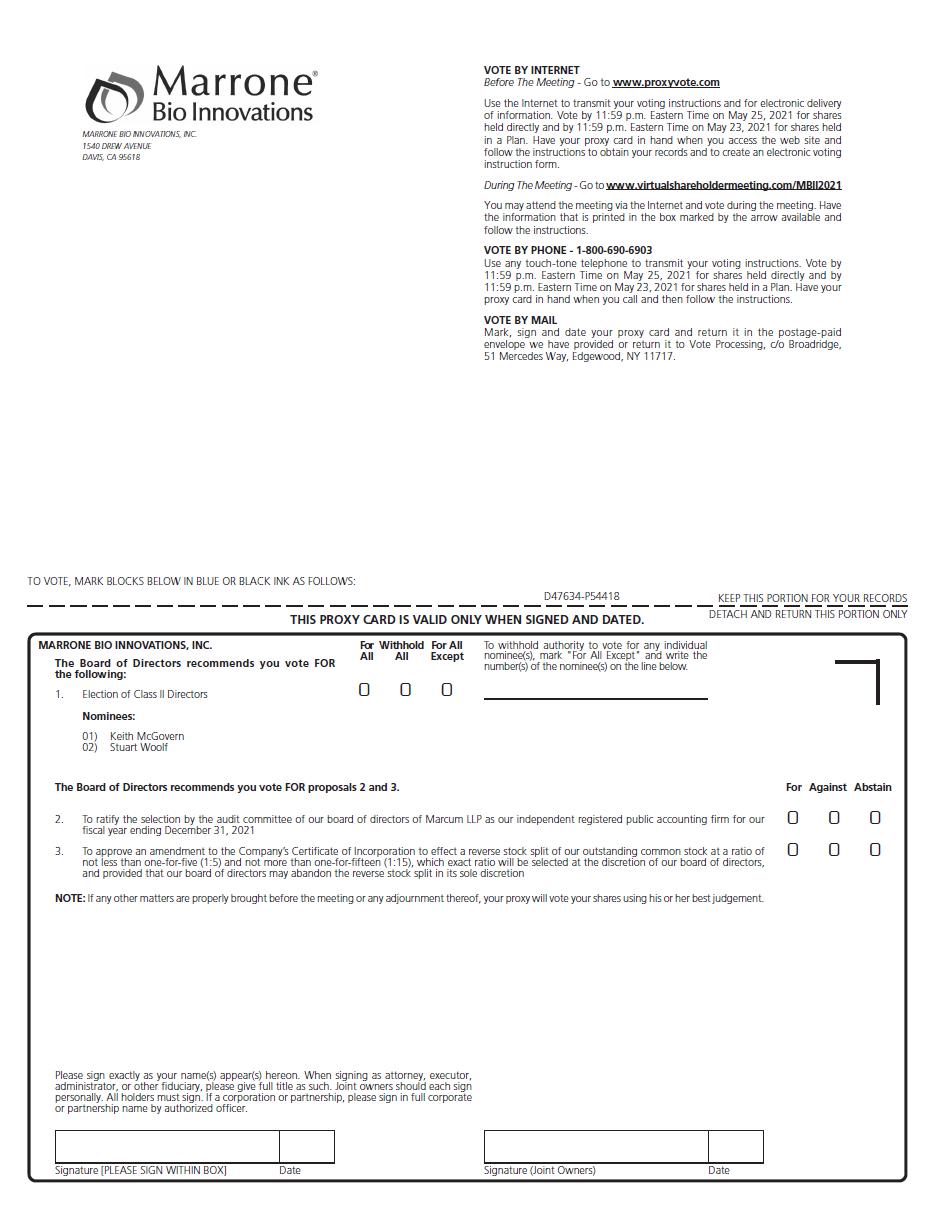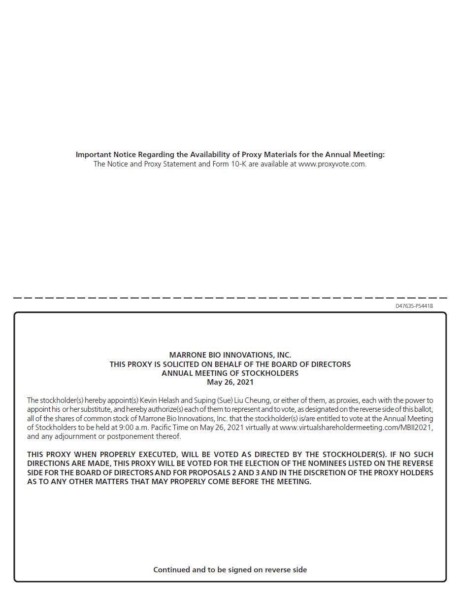 You are cordially invited to attend the 2021 annual meeting of stockholders of Marrone Bio Innovations, Inc., a Delaware corporation. The meeting will be held on May 26, 2021 at 9:00 a.m. Pacific Time. The annual meeting will be a virtual meeting of stockholders conducted online by live audio webcast. You will be able to attend the virtual meeting, vote your shares electronically and submit questions during the meeting by visiting www.virtualshareholdermeeting.com/MBII2021.