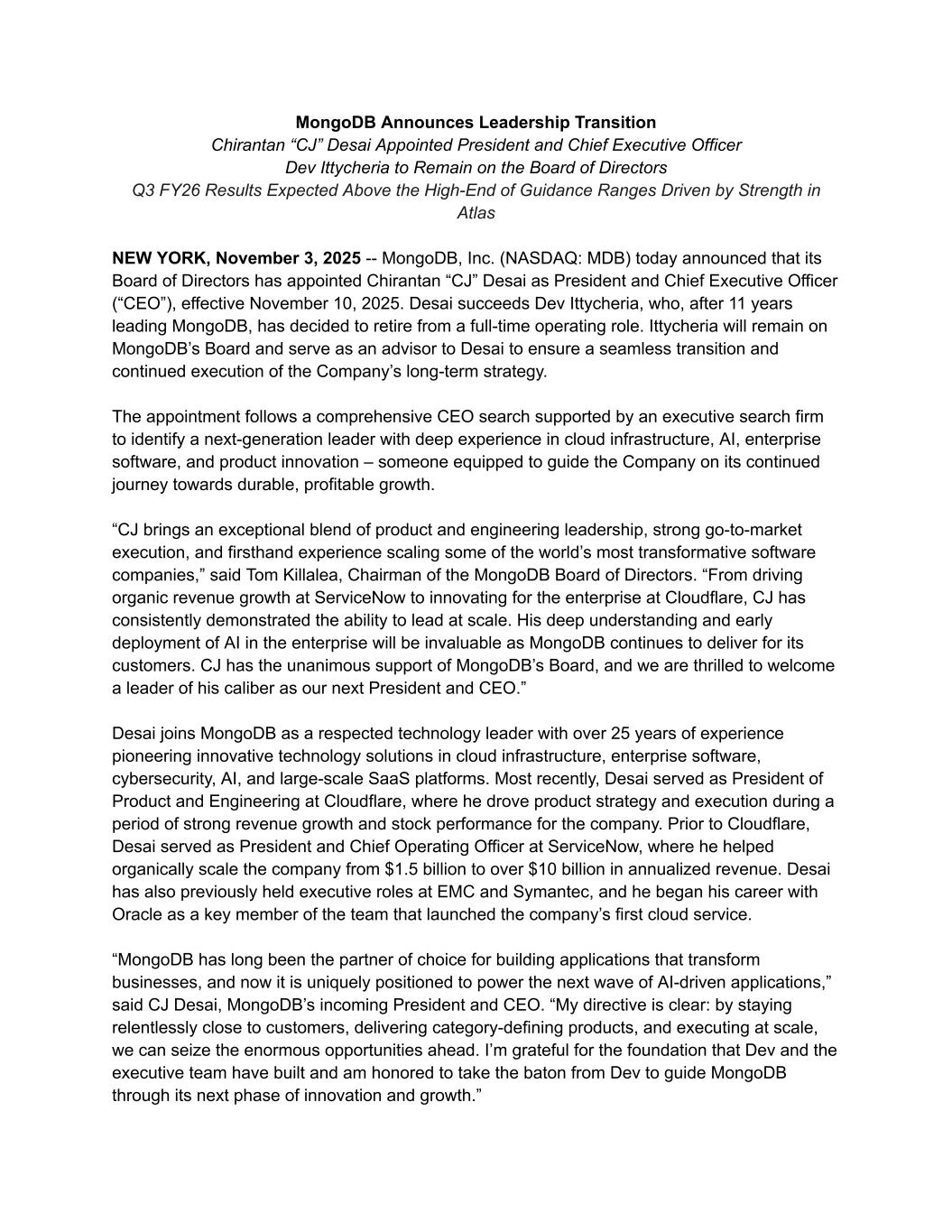 MongoDB Announces Leadership Transition Chirantan “CJ” Desai Appointed President and Chief Executive Officer Dev Ittycheria to Remain on the Board of Directors Q3 FY26 Results Expected Above the High-End of Guidance Ranges Driven by Strength in Atlas NEW YORK, November 3, 2025 -- MongoDB, Inc. (NASDAQ: MDB) today announced that its Board of Directors has appointed Chirantan “CJ” Desai as President and Chief Executive Officer (“CEO”), effective November 10, 2025. Desai succeeds Dev Ittycheria, who, after 11 years leading MongoDB, has decided to retire from a full-time operating role. Ittycheria will remain on MongoDB’s Board and serve as an advisor to Desai to ensure a seamless transition and continued execution of the Company’s long-term strategy. The appointment follows a comprehensive CEO search supported by an executive search firm to identify a next-generation leader with deep experience in cloud infrastructure, AI, enterprise software, and product innovation – someone equipped to guide the Company on its continued journey towards durable, profitable growth. “CJ brings an exceptional blend of product and engineering leadership, strong go-to-market execution, and firsthand experience scaling some of the world’s most transformative software companies,” said Tom Killalea, Chairman of the MongoDB Board of Directors. “From driving organic revenue growth at ServiceNow to innovating for the enterprise at Cloudflare, CJ has consistently demonstrated the ability to lead at scale. His deep understanding and early deployment of AI in the enterprise will be invaluable as MongoDB continues to deliver for its customers. CJ has the unanimous support of MongoDB’s Board, and we are thrilled to welcome a leader of his caliber as our next President and CEO.” Desai joins MongoDB as a respected technology leader with over 25 years of experience pioneering innovative technology solutions in cloud infrastructure, enterprise software, cybersecurity, AI, and large-scale SaaS platforms. Most recently, Desai served as President of Product and Engineering at Cloudflare, where he drove product strategy and execution during a period of strong revenue growth and stock performance for the company. Prior to Cloudflare, Desai served as President and Chief Operating Officer at ServiceNow, where he helped organically scale the company from $1.5 billion to over $10 billion in annualized revenue. Desai has also previously held executive roles at EMC and Symantec, and he began his career with Oracle as a key member of the team that launched the company’s first cloud service. “MongoDB has long been the partner of choice for building applications that transform businesses, and now it is uniquely positioned to power the next wave of AI-driven applications,” said CJ Desai, MongoDB’s incoming President and CEO. “My directive is clear: by staying relentlessly close to customers, delivering category-defining products, and executing at scale, we can seize the enormous opportunities ahead. I’m grateful for the foundation that Dev and the executive team have built and am honored to take the baton from Dev to guide MongoDB through its next phase of innovation and growth.”