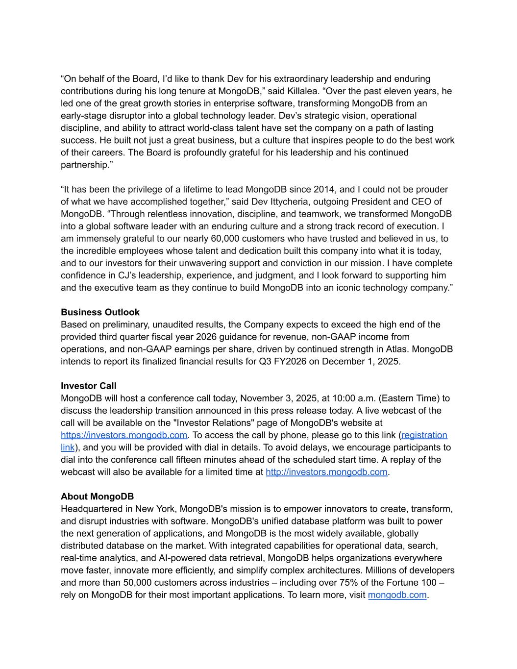 “On behalf of the Board, I’d like to thank Dev for his extraordinary leadership and enduring contributions during his long tenure at MongoDB,” said Killalea. “Over the past eleven years, he led one of the great growth stories in enterprise software, transforming MongoDB from an early-stage disruptor into a global technology leader. Dev’s strategic vision, operational discipline, and ability to attract world-class talent have set the company on a path of lasting success. He built not just a great business, but a culture that inspires people to do the best work of their careers. The Board is profoundly grateful for his leadership and his continued partnership.” “It has been the privilege of a lifetime to lead MongoDB since 2014, and I could not be prouder of what we have accomplished together,” said Dev Ittycheria, outgoing President and CEO of MongoDB. “Through relentless innovation, discipline, and teamwork, we transformed MongoDB into a global software leader with an enduring culture and a strong track record of execution. I am immensely grateful to our nearly 60,000 customers who have trusted and believed in us, to the incredible employees whose talent and dedication built this company into what it is today, and to our investors for their unwavering support and conviction in our mission. I have complete confidence in CJ’s leadership, experience, and judgment, and I look forward to supporting him and the executive team as they continue to build MongoDB into an iconic technology company.” Business Outlook Based on preliminary, unaudited results, the Company expects to exceed the high end of the provided third quarter fiscal year 2026 guidance for revenue, non-GAAP income from operations, and non-GAAP earnings per share, driven by continued strength in Atlas. MongoDB intends to report its finalized financial results for Q3 FY2026 on December 1, 2025. Investor Call MongoDB will host a conference call today, November 3, 2025, at 10:00 a.m. (Eastern Time) to discuss the leadership transition announced in this press release today. A live webcast of the call will be available on the "Investor Relations" page of MongoDB's website at https://investors.mongodb.com. To access the call by phone, please go to this link (registration link), and you will be provided with dial in details. To avoid delays, we encourage participants to dial into the conference call fifteen minutes ahead of the scheduled start time. A replay of the webcast will also be available for a limited time at http://investors.mongodb.com. About MongoDB Headquartered in New York, MongoDB's mission is to empower innovators to create, transform, and disrupt industries with software. MongoDB's unified database platform was built to power the next generation of applications, and MongoDB is the most widely available, globally distributed database on the market. With integrated capabilities for operational data, search, real-time analytics, and AI-powered data retrieval, MongoDB helps organizations everywhere move faster, innovate more efficiently, and simplify complex architectures. Millions of developers and more than 50,000 customers across industries – including over 75% of the Fortune 100 – rely on MongoDB for their most important applications. To learn more, visit mongodb.com.
