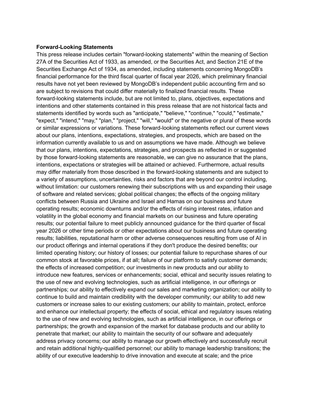 Forward-Looking Statements This press release includes certain "forward-looking statements" within the meaning of Section 27A of the Securities Act of 1933, as amended, or the Securities Act, and Section 21E of the Securities Exchange Act of 1934, as amended, including statements concerning MongoDB’s financial performance for the third fiscal quarter of fiscal year 2026, which preliminary financial results have not yet been reviewed by MongoDB’s independent public accounting firm and so are subject to revisions that could differ materially to finalized financial results. These forward-looking statements include, but are not limited to, plans, objectives, expectations and intentions and other statements contained in this press release that are not historical facts and statements identified by words such as "anticipate," "believe," "continue," "could," "estimate," "expect," "intend," "may," "plan," "project," "will," "would" or the negative or plural of these words or similar expressions or variations. These forward-looking statements reflect our current views about our plans, intentions, expectations, strategies, and prospects, which are based on the information currently available to us and on assumptions we have made. Although we believe that our plans, intentions, expectations, strategies, and prospects as reflected in or suggested by those forward-looking statements are reasonable, we can give no assurance that the plans, intentions, expectations or strategies will be attained or achieved. Furthermore, actual results may differ materially from those described in the forward-looking statements and are subject to a variety of assumptions, uncertainties, risks and factors that are beyond our control including, without limitation: our customers renewing their subscriptions with us and expanding their usage of software and related services; global political changes; the effects of the ongoing military conflicts between Russia and Ukraine and Israel and Hamas on our business and future operating results; economic downturns and/or the effects of rising interest rates, inflation and volatility in the global economy and financial markets on our business and future operating results; our potential failure to meet publicly announced guidance for the third quarter of fiscal year 2026 or other time periods or other expectations about our business and future operating results; liabilities, reputational harm or other adverse consequences resulting from use of AI in our product offerings and internal operations if they don't produce the desired benefits; our limited operating history; our history of losses; our potential failure to repurchase shares of our common stock at favorable prices, if at all; failure of our platform to satisfy customer demands; the effects of increased competition; our investments in new products and our ability to introduce new features, services or enhancements; social, ethical and security issues relating to the use of new and evolving technologies, such as artificial intelligence, in our offerings or partnerships; our ability to effectively expand our sales and marketing organization; our ability to continue to build and maintain credibility with the developer community; our ability to add new customers or increase sales to our existing customers; our ability to maintain, protect, enforce and enhance our intellectual property; the effects of social, ethical and regulatory issues relating to the use of new and evolving technologies, such as artificial intelligence, in our offerings or partnerships; the growth and expansion of the market for database products and our ability to penetrate that market; our ability to maintain the security of our software and adequately address privacy concerns; our ability to manage our growth effectively and successfully recruit and retain additional highly-qualified personnel; our ability to manage leadership transitions; the ability of our executive leadership to drive innovation and execute at scale; and the price