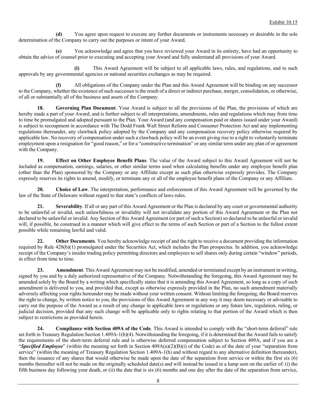 Exhibit 10.15 8 (d) You agree upon request to execute any further documents or instruments necessary or desirable in the sole determination of the Company to carry out the purposes or intent of your Award. (e) You acknowledge and agree that you have reviewed your Award in its entirety, have had an opportunity to obtain the advice of counsel prior to executing and accepting your Award and fully understand all provisions of your Award. (i) This Award Agreement will be subject to all applicable laws, rules, and regulations, and to such approvals by any governmental agencies or national securities exchanges as may be required. (f) All obligations of the Company under the Plan and this Award Agreement will be binding on any successor to the Company, whether the existence of such successor is the result of a direct or indirect purchase, merger, consolidation, or otherwise, of all or substantially all of the business and assets of the Company. 18. Governing Plan Document. Your Award is subject to all the provisions of the Plan, the provisions of which are hereby made a part of your Award, and is further subject to all interpretations, amendments, rules and regulations which may from time to time be promulgated and adopted pursuant to the Plan. Your Award (and any compensation paid or shares issued under your Award) is subject to recoupment in accordance with The Dodd Frank Wall Street Reform and Consumer Protection Act and any implementing regulations thereunder, any clawback policy adopted by the Company and any compensation recovery policy otherwise required by applicable law. No recovery of compensation under such a clawback policy will be an event giving rise to a right to voluntarily terminate employment upon a resignation for “good reason,” or for a “constructive termination” or any similar term under any plan of or agreement with the Company. 19. Effect on Other Employee Benefit Plans. The value of the Award subject to this Award Agreement will not be included as compensation, earnings, salaries, or other similar terms used when calculating benefits under any employee benefit plan (other than the Plan) sponsored by the Company or any Affiliate except as such plan otherwise expressly provides. The Company expressly reserves its rights to amend, modify, or terminate any or all of the employee benefit plans of the Company or any Affiliate. 20. Choice of Law. The interpretation, performance and enforcement of this Award Agreement will be governed by the law of the State of Delaware without regard to that state’s conflicts of laws rules. 21. Severability. If all or any part of this Award Agreement or the Plan is declared by any court or governmental authority to be unlawful or invalid, such unlawfulness or invalidity will not invalidate any portion of this Award Agreement or the Plan not declared to be unlawful or invalid. Any Section of this Award Agreement (or part of such a Section) so declared to be unlawful or invalid will, if possible, be construed in a manner which will give effect to the terms of such Section or part of a Section to the fullest extent possible while remaining lawful and valid. 22. Other Documents. You hereby acknowledge receipt of and the right to receive a document providing the information required by Rule 428(b)(1) promulgated under the Securities Act, which includes the Plan prospectus. In addition, you acknowledge receipt of the Company’s insider trading policy permitting directors and employees to sell shares only during certain “window” periods, in effect from time to time. 23. Amendment. This Award Agreement may not be modified, amended or terminated except by an instrument in writing, signed by you and by a duly authorized representative of the Company. Notwithstanding the foregoing, this Award Agreement may be amended solely by the Board by a writing which specifically states that it is amending this Award Agreement, so long as a copy of such amendment is delivered to you, and provided that, except as otherwise expressly provided in the Plan, no such amendment materially adversely affecting your rights hereunder may be made without your written consent. Without limiting the foregoing, the Board reserves the right to change, by written notice to you, the provisions of this Award Agreement in any way it may deem necessary or advisable to carry out the purpose of the Award as a result of any change in applicable laws or regulations or any future law, regulation, ruling, or judicial decision, provided that any such change will be applicable only to rights relating to that portion of the Award which is then subject to restrictions as provided herein. 24. Compliance with Section 409A of the Code. This Award is intended to comply with the “short-term deferral” rule set forth in Treasury Regulation Section 1.409A-1(b)(4). Notwithstanding the foregoing, if it is determined that the Award fails to satisfy the requirements of the short-term deferral rule and is otherwise deferred compensation subject to Section 409A, and if you are a “Specified Employee” (within the meaning set forth in Section 409A(a)(2)(B)(i) of the Code) as of the date of your “separation from service” (within the meaning of Treasury Regulation Section 1.409A-1(h) and without regard to any alternative definition thereunder), then the issuance of any shares that would otherwise be made upon the date of the separation from service or within the first six (6) months thereafter will not be made on the originally scheduled date(s) and will instead be issued in a lump sum on the earlier of: (i) the fifth business day following your death, or (ii) the date that is six (6) months and one day after the date of the separation from service,