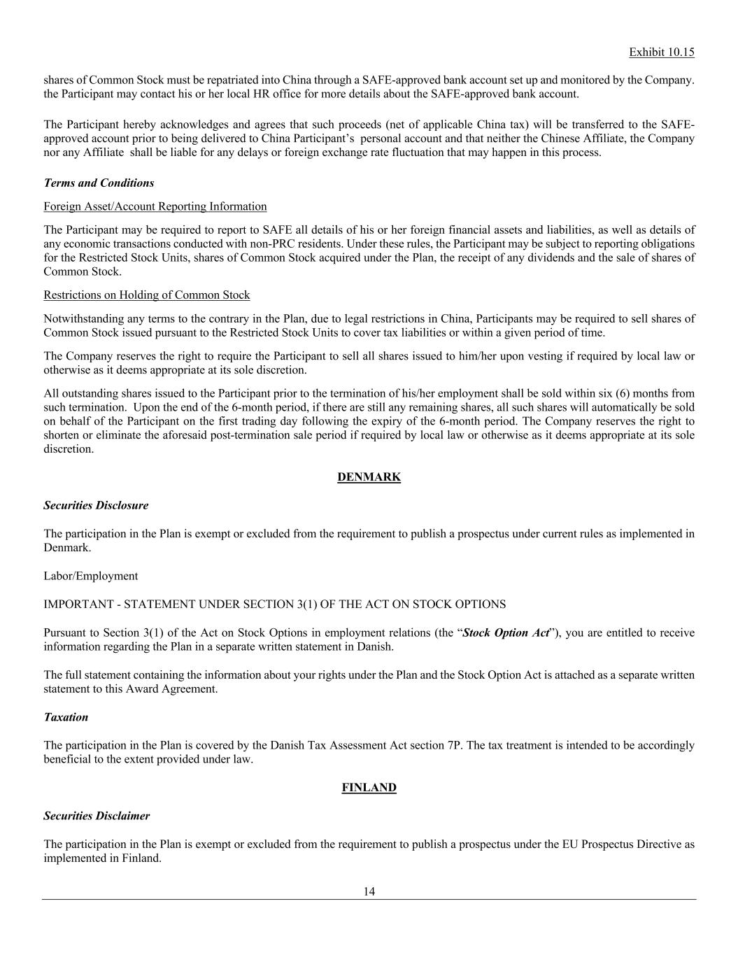 Exhibit 10.15 14 shares of Common Stock must be repatriated into China through a SAFE-approved bank account set up and monitored by the Company. the Participant may contact his or her local HR office for more details about the SAFE-approved bank account. The Participant hereby acknowledges and agrees that such proceeds (net of applicable China tax) will be transferred to the SAFE- approved account prior to being delivered to China Participant’s personal account and that neither the Chinese Affiliate, the Company nor any Affiliate shall be liable for any delays or foreign exchange rate fluctuation that may happen in this process. Terms and Conditions Foreign Asset/Account Reporting Information The Participant may be required to report to SAFE all details of his or her foreign financial assets and liabilities, as well as details of any economic transactions conducted with non-PRC residents. Under these rules, the Participant may be subject to reporting obligations for the Restricted Stock Units, shares of Common Stock acquired under the Plan, the receipt of any dividends and the sale of shares of Common Stock. Restrictions on Holding of Common Stock Notwithstanding any terms to the contrary in the Plan, due to legal restrictions in China, Participants may be required to sell shares of Common Stock issued pursuant to the Restricted Stock Units to cover tax liabilities or within a given period of time. The Company reserves the right to require the Participant to sell all shares issued to him/her upon vesting if required by local law or otherwise as it deems appropriate at its sole discretion. All outstanding shares issued to the Participant prior to the termination of his/her employment shall be sold within six (6) months from such termination. Upon the end of the 6-month period, if there are still any remaining shares, all such shares will automatically be sold on behalf of the Participant on the first trading day following the expiry of the 6-month period. The Company reserves the right to shorten or eliminate the aforesaid post-termination sale period if required by local law or otherwise as it deems appropriate at its sole discretion. DENMARK Securities Disclosure The participation in the Plan is exempt or excluded from the requirement to publish a prospectus under current rules as implemented in Denmark. Labor/Employment IMPORTANT - STATEMENT UNDER SECTION 3(1) OF THE ACT ON STOCK OPTIONS Pursuant to Section 3(1) of the Act on Stock Options in employment relations (the “Stock Option Act”), you are entitled to receive information regarding the Plan in a separate written statement in Danish. The full statement containing the information about your rights under the Plan and the Stock Option Act is attached as a separate written statement to this Award Agreement. Taxation The participation in the Plan is covered by the Danish Tax Assessment Act section 7P. The tax treatment is intended to be accordingly beneficial to the extent provided under law. FINLAND Securities Disclaimer The participation in the Plan is exempt or excluded from the requirement to publish a prospectus under the EU Prospectus Directive as implemented in Finland.