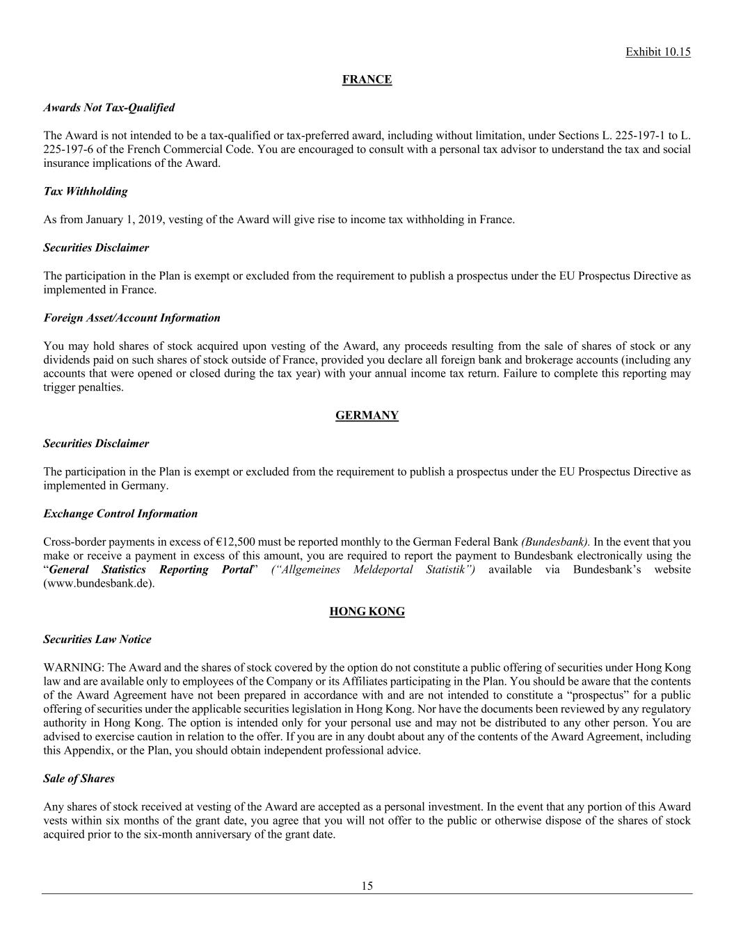 Exhibit 10.15 15 FRANCE Awards Not Tax-Qualified The Award is not intended to be a tax-qualified or tax-preferred award, including without limitation, under Sections L. 225-197-1 to L. 225-197-6 of the French Commercial Code. You are encouraged to consult with a personal tax advisor to understand the tax and social insurance implications of the Award. Tax Withholding As from January 1, 2019, vesting of the Award will give rise to income tax withholding in France. Securities Disclaimer The participation in the Plan is exempt or excluded from the requirement to publish a prospectus under the EU Prospectus Directive as implemented in France. Foreign Asset/Account Information You may hold shares of stock acquired upon vesting of the Award, any proceeds resulting from the sale of shares of stock or any dividends paid on such shares of stock outside of France, provided you declare all foreign bank and brokerage accounts (including any accounts that were opened or closed during the tax year) with your annual income tax return. Failure to complete this reporting may trigger penalties. GERMANY Securities Disclaimer The participation in the Plan is exempt or excluded from the requirement to publish a prospectus under the EU Prospectus Directive as implemented in Germany. Exchange Control Information Cross-border payments in excess of €12,500 must be reported monthly to the German Federal Bank (Bundesbank). In the event that you make or receive a payment in excess of this amount, you are required to report the payment to Bundesbank electronically using the “General Statistics Reporting Portal” (“Allgemeines Meldeportal Statistik”) available via Bundesbank’s website (www.bundesbank.de). HONG KONG Securities Law Notice WARNING: The Award and the shares of stock covered by the option do not constitute a public offering of securities under Hong Kong law and are available only to employees of the Company or its Affiliates participating in the Plan. You should be aware that the contents of the Award Agreement have not been prepared in accordance with and are not intended to constitute a “prospectus” for a public offering of securities under the applicable securities legislation in Hong Kong. Nor have the documents been reviewed by any regulatory authority in Hong Kong. The option is intended only for your personal use and may not be distributed to any other person. You are advised to exercise caution in relation to the offer. If you are in any doubt about any of the contents of the Award Agreement, including this Appendix, or the Plan, you should obtain independent professional advice. Sale of Shares Any shares of stock received at vesting of the Award are accepted as a personal investment. In the event that any portion of this Award vests within six months of the grant date, you agree that you will not offer to the public or otherwise dispose of the shares of stock acquired prior to the six-month anniversary of the grant date.