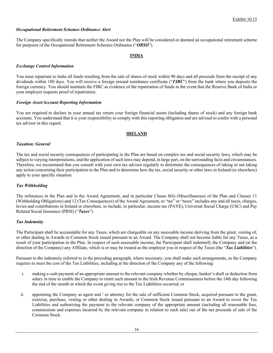 Exhibit 10.15 16 Occupational Retirement Schemes Ordinance Alert The Company specifically intends that neither the Award nor the Plan will be considered or deemed an occupational retirement scheme for purposes of the Occupational Retirement Schemes Ordinance (“ORSO”). INDIA Exchange Control Information You must repatriate to India all funds resulting from the sale of shares of stock within 90 days and all proceeds from the receipt of any dividends within 180 days. You will receive a foreign inward remittance certificate (“FIRC”) from the bank where you deposits the foreign currency. You should maintain the FIRC as evidence of the repatriation of funds in the event that the Reserve Bank of India or your employer requests proof of repatriation. Foreign Asset/Account Reporting Information You are required to declare in your annual tax return your foreign financial assets (including shares of stock) and any foreign bank accounts. You understand that it is your responsibility to comply with this reporting obligation and are advised to confer with a personal tax advisor in this regard. IRELAND Taxation: General The tax and social security consequences of participating in the Plan are based on complex tax and social security laws, which may be subject to varying interpretations, and the application of such laws may depend, in large part, on the surrounding facts and circumstances. Therefore, we recommend that you consult with your own tax advisor regularly to determine the consequences of taking or not taking any action concerning their participation in the Plan and to determine how the tax, social security or other laws in Ireland (or elsewhere) apply to your specific situation. Tax Withholding The references in the Plan and in the Award Agreement, and in particular Clause 8(h) (Miscellaneous) of the Plan and Clauses 11 (Withholding Obligations) and 12 (Tax Consequences) of the Award Agreement, to “tax” or “taxes” includes any and all taxes, charges, levies and contributions in Ireland or elsewhere, to include, in particular, income tax (PAYE), Universal Social Charge (USC) and Pay Related Social Insurance (PRSI) (“Taxes”). Tax Indemnity The Participant shall be accountable for any Taxes, which are chargeable on any assessable income deriving from the grant, vesting of, or other dealing in Awards or Common Stock issued pursuant to an Award. The Company shall not become liable for any Taxes, as a result of your participation in the Plan. In respect of such assessable income, the Participant shall indemnify the Company and (at the direction of the Company) any Affiliate, which is or may be treated as the employer you in respect of the Taxes (the “Tax Liabilities”). Pursuant to the indemnity referred to in the preceding paragraph, where necessary, you shall make such arrangements, as the Company requires to meet the cost of the Tax Liabilities, including at the direction of the Company any of the following: i. making a cash payment of an appropriate amount to the relevant company whether by cheque, banker’s draft or deduction from salary in time to enable the Company to remit such amount to the Irish Revenue Commissioners before the 14th day following the end of the month in which the event giving rise to the Tax Liabilities occurred; or ii. appointing the Company as agent and / or attorney for the sale of sufficient Common Stock, acquired pursuant to the grant, exercise, purchase, vesting or other dealing in Awards, or Common Stock issued pursuant to an Award to cover the Tax Liabilities and authorizing the payment to the relevant company of the appropriate amount (including all reasonable fees, commissions and expenses incurred by the relevant company in relation to such sale) out of the net proceeds of sale of the Common Stock.