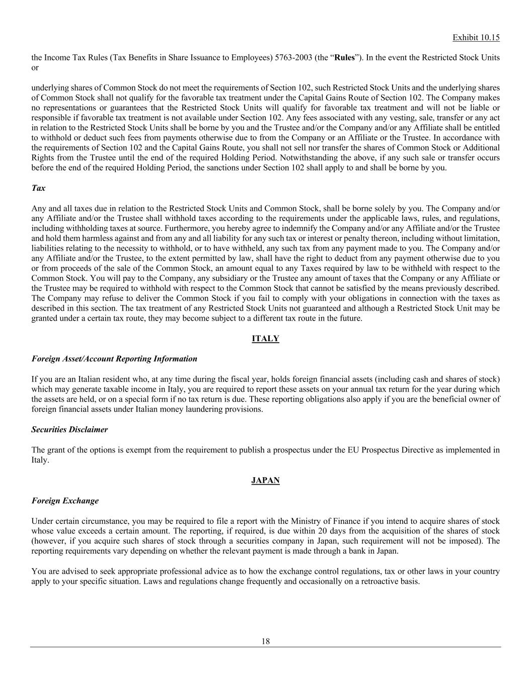 Exhibit 10.15 18 the Income Tax Rules (Tax Benefits in Share Issuance to Employees) 5763-2003 (the “Rules”). In the event the Restricted Stock Units or underlying shares of Common Stock do not meet the requirements of Section 102, such Restricted Stock Units and the underlying shares of Common Stock shall not qualify for the favorable tax treatment under the Capital Gains Route of Section 102. The Company makes no representations or guarantees that the Restricted Stock Units will qualify for favorable tax treatment and will not be liable or responsible if favorable tax treatment is not available under Section 102. Any fees associated with any vesting, sale, transfer or any act in relation to the Restricted Stock Units shall be borne by you and the Trustee and/or the Company and/or any Affiliate shall be entitled to withhold or deduct such fees from payments otherwise due to from the Company or an Affiliate or the Trustee. In accordance with the requirements of Section 102 and the Capital Gains Route, you shall not sell nor transfer the shares of Common Stock or Additional Rights from the Trustee until the end of the required Holding Period. Notwithstanding the above, if any such sale or transfer occurs before the end of the required Holding Period, the sanctions under Section 102 shall apply to and shall be borne by you. Tax Any and all taxes due in relation to the Restricted Stock Units and Common Stock, shall be borne solely by you. The Company and/or any Affiliate and/or the Trustee shall withhold taxes according to the requirements under the applicable laws, rules, and regulations, including withholding taxes at source. Furthermore, you hereby agree to indemnify the Company and/or any Affiliate and/or the Trustee and hold them harmless against and from any and all liability for any such tax or interest or penalty thereon, including without limitation, liabilities relating to the necessity to withhold, or to have withheld, any such tax from any payment made to you. The Company and/or any Affiliate and/or the Trustee, to the extent permitted by law, shall have the right to deduct from any payment otherwise due to you or from proceeds of the sale of the Common Stock, an amount equal to any Taxes required by law to be withheld with respect to the Common Stock. You will pay to the Company, any subsidiary or the Trustee any amount of taxes that the Company or any Affiliate or the Trustee may be required to withhold with respect to the Common Stock that cannot be satisfied by the means previously described. The Company may refuse to deliver the Common Stock if you fail to comply with your obligations in connection with the taxes as described in this section. The tax treatment of any Restricted Stock Units not guaranteed and although a Restricted Stock Unit may be granted under a certain tax route, they may become subject to a different tax route in the future. ITALY Foreign Asset/Account Reporting Information If you are an Italian resident who, at any time during the fiscal year, holds foreign financial assets (including cash and shares of stock) which may generate taxable income in Italy, you are required to report these assets on your annual tax return for the year during which the assets are held, or on a special form if no tax return is due. These reporting obligations also apply if you are the beneficial owner of foreign financial assets under Italian money laundering provisions. Securities Disclaimer The grant of the options is exempt from the requirement to publish a prospectus under the EU Prospectus Directive as implemented in Italy. JAPAN Foreign Exchange Under certain circumstance, you may be required to file a report with the Ministry of Finance if you intend to acquire shares of stock whose value exceeds a certain amount. The reporting, if required, is due within 20 days from the acquisition of the shares of stock (however, if you acquire such shares of stock through a securities company in Japan, such requirement will not be imposed). The reporting requirements vary depending on whether the relevant payment is made through a bank in Japan. You are advised to seek appropriate professional advice as to how the exchange control regulations, tax or other laws in your country apply to your specific situation. Laws and regulations change frequently and occasionally on a retroactive basis.