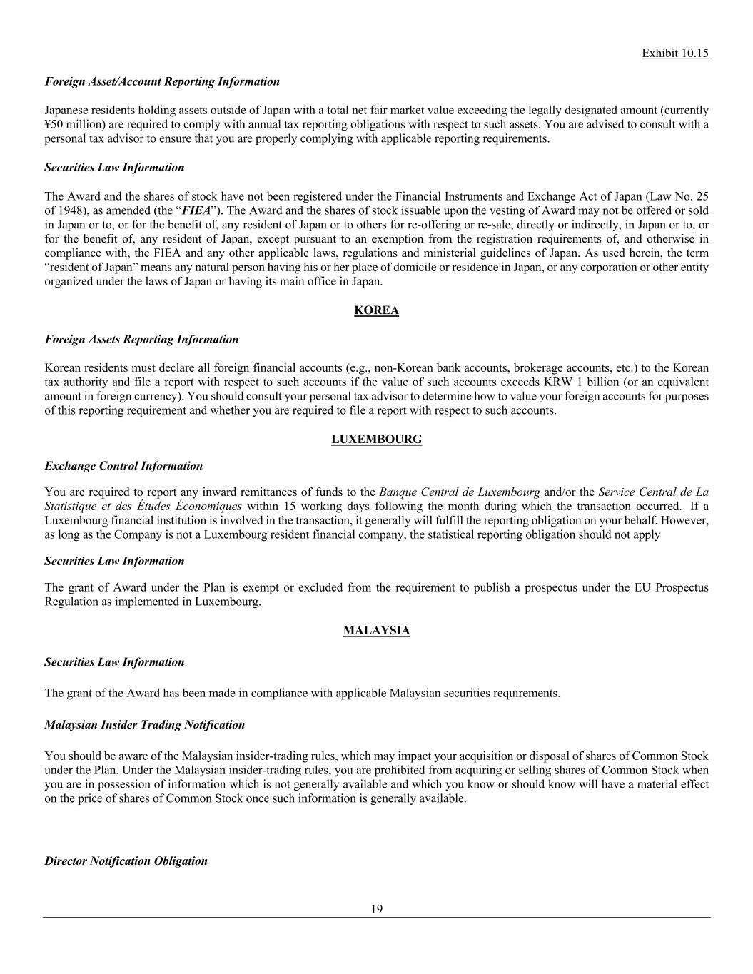 Exhibit 10.15 19 Foreign Asset/Account Reporting Information Japanese residents holding assets outside of Japan with a total net fair market value exceeding the legally designated amount (currently ¥50 million) are required to comply with annual tax reporting obligations with respect to such assets. You are advised to consult with a personal tax advisor to ensure that you are properly complying with applicable reporting requirements. Securities Law Information The Award and the shares of stock have not been registered under the Financial Instruments and Exchange Act of Japan (Law No. 25 of 1948), as amended (the “FIEA”). The Award and the shares of stock issuable upon the vesting of Award may not be offered or sold in Japan or to, or for the benefit of, any resident of Japan or to others for re-offering or re-sale, directly or indirectly, in Japan or to, or for the benefit of, any resident of Japan, except pursuant to an exemption from the registration requirements of, and otherwise in compliance with, the FIEA and any other applicable laws, regulations and ministerial guidelines of Japan. As used herein, the term “resident of Japan” means any natural person having his or her place of domicile or residence in Japan, or any corporation or other entity organized under the laws of Japan or having its main office in Japan. KOREA Foreign Assets Reporting Information Korean residents must declare all foreign financial accounts (e.g., non-Korean bank accounts, brokerage accounts, etc.) to the Korean tax authority and file a report with respect to such accounts if the value of such accounts exceeds KRW 1 billion (or an equivalent amount in foreign currency). You should consult your personal tax advisor to determine how to value your foreign accounts for purposes of this reporting requirement and whether you are required to file a report with respect to such accounts. LUXEMBOURG Exchange Control Information You are required to report any inward remittances of funds to the Banque Central de Luxembourg and/or the Service Central de La Statistique et des Études Économiques within 15 working days following the month during which the transaction occurred. If a Luxembourg financial institution is involved in the transaction, it generally will fulfill the reporting obligation on your behalf. However, as long as the Company is not a Luxembourg resident financial company, the statistical reporting obligation should not apply Securities Law Information The grant of Award under the Plan is exempt or excluded from the requirement to publish a prospectus under the EU Prospectus Regulation as implemented in Luxembourg. MALAYSIA Securities Law Information The grant of the Award has been made in compliance with applicable Malaysian securities requirements. Malaysian Insider Trading Notification You should be aware of the Malaysian insider-trading rules, which may impact your acquisition or disposal of shares of Common Stock under the Plan. Under the Malaysian insider-trading rules, you are prohibited from acquiring or selling shares of Common Stock when you are in possession of information which is not generally available and which you know or should know will have a material effect on the price of shares of Common Stock once such information is generally available. Director Notification Obligation