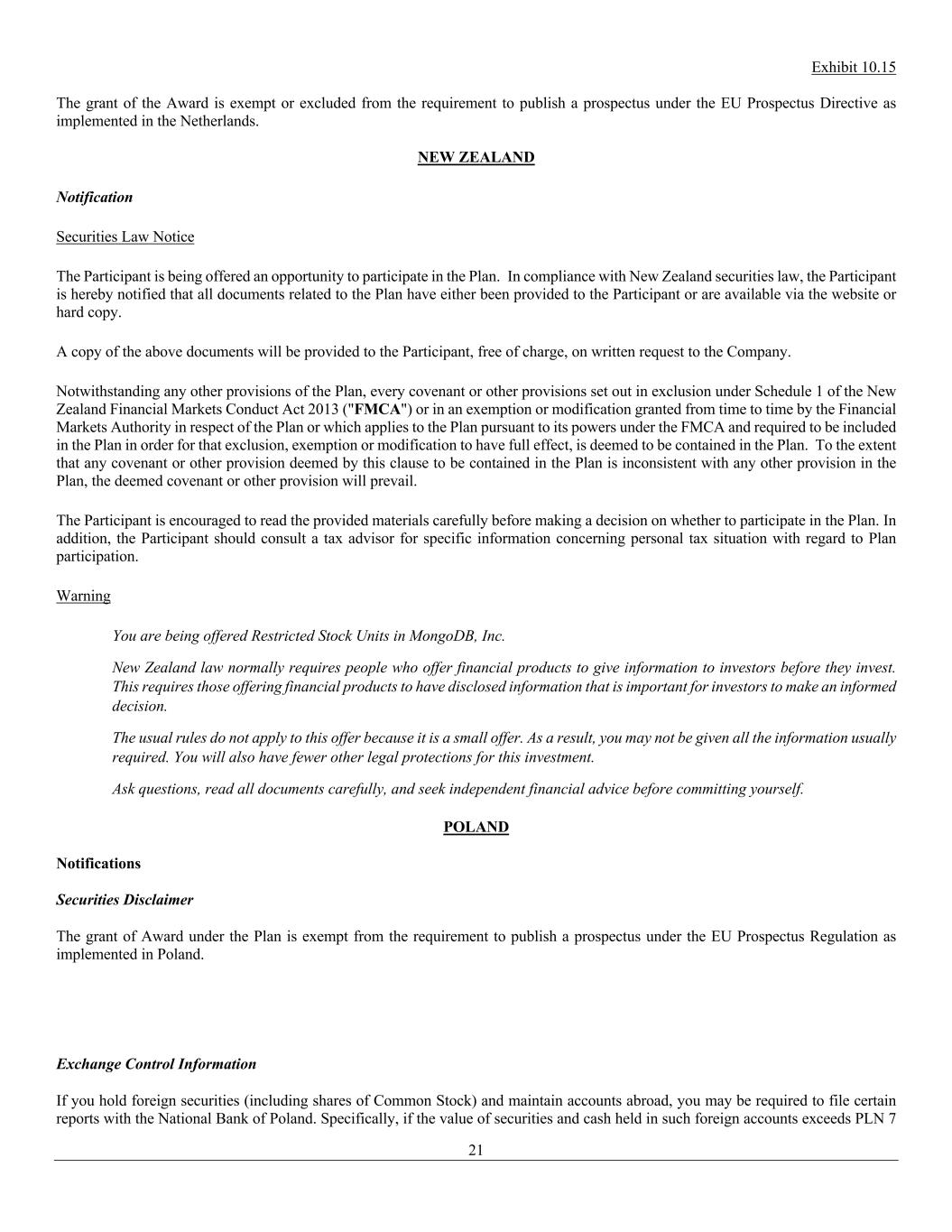 Exhibit 10.15 21 The grant of the Award is exempt or excluded from the requirement to publish a prospectus under the EU Prospectus Directive as implemented in the Netherlands. NEW ZEALAND Notification Securities Law Notice The Participant is being offered an opportunity to participate in the Plan. In compliance with New Zealand securities law, the Participant is hereby notified that all documents related to the Plan have either been provided to the Participant or are available via the website or hard copy. A copy of the above documents will be provided to the Participant, free of charge, on written request to the Company. Notwithstanding any other provisions of the Plan, every covenant or other provisions set out in exclusion under Schedule 1 of the New Zealand Financial Markets Conduct Act 2013 ("FMCA") or in an exemption or modification granted from time to time by the Financial Markets Authority in respect of the Plan or which applies to the Plan pursuant to its powers under the FMCA and required to be included in the Plan in order for that exclusion, exemption or modification to have full effect, is deemed to be contained in the Plan. To the extent that any covenant or other provision deemed by this clause to be contained in the Plan is inconsistent with any other provision in the Plan, the deemed covenant or other provision will prevail. The Participant is encouraged to read the provided materials carefully before making a decision on whether to participate in the Plan. In addition, the Participant should consult a tax advisor for specific information concerning personal tax situation with regard to Plan participation. Warning You are being offered Restricted Stock Units in MongoDB, Inc. New Zealand law normally requires people who offer financial products to give information to investors before they invest. This requires those offering financial products to have disclosed information that is important for investors to make an informed decision. The usual rules do not apply to this offer because it is a small offer. As a result, you may not be given all the information usually required. You will also have fewer other legal protections for this investment. Ask questions, read all documents carefully, and seek independent financial advice before committing yourself. POLAND Notifications Securities Disclaimer The grant of Award under the Plan is exempt from the requirement to publish a prospectus under the EU Prospectus Regulation as implemented in Poland. Exchange Control Information If you hold foreign securities (including shares of Common Stock) and maintain accounts abroad, you may be required to file certain reports with the National Bank of Poland. Specifically, if the value of securities and cash held in such foreign accounts exceeds PLN 7
