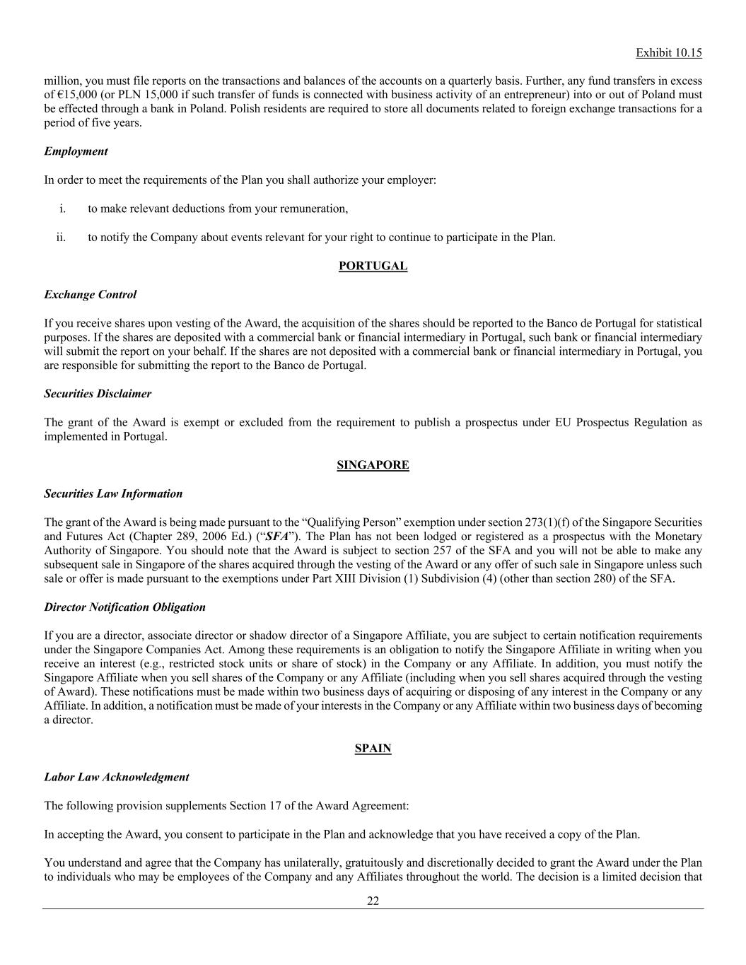 Exhibit 10.15 22 million, you must file reports on the transactions and balances of the accounts on a quarterly basis. Further, any fund transfers in excess of €15,000 (or PLN 15,000 if such transfer of funds is connected with business activity of an entrepreneur) into or out of Poland must be effected through a bank in Poland. Polish residents are required to store all documents related to foreign exchange transactions for a period of five years. Employment In order to meet the requirements of the Plan you shall authorize your employer: i. to make relevant deductions from your remuneration, ii. to notify the Company about events relevant for your right to continue to participate in the Plan. PORTUGAL Exchange Control If you receive shares upon vesting of the Award, the acquisition of the shares should be reported to the Banco de Portugal for statistical purposes. If the shares are deposited with a commercial bank or financial intermediary in Portugal, such bank or financial intermediary will submit the report on your behalf. If the shares are not deposited with a commercial bank or financial intermediary in Portugal, you are responsible for submitting the report to the Banco de Portugal. Securities Disclaimer The grant of the Award is exempt or excluded from the requirement to publish a prospectus under EU Prospectus Regulation as implemented in Portugal. SINGAPORE Securities Law Information The grant of the Award is being made pursuant to the “Qualifying Person” exemption under section 273(1)(f) of the Singapore Securities and Futures Act (Chapter 289, 2006 Ed.) (“SFA”). The Plan has not been lodged or registered as a prospectus with the Monetary Authority of Singapore. You should note that the Award is subject to section 257 of the SFA and you will not be able to make any subsequent sale in Singapore of the shares acquired through the vesting of the Award or any offer of such sale in Singapore unless such sale or offer is made pursuant to the exemptions under Part XIII Division (1) Subdivision (4) (other than section 280) of the SFA. Director Notification Obligation If you are a director, associate director or shadow director of a Singapore Affiliate, you are subject to certain notification requirements under the Singapore Companies Act. Among these requirements is an obligation to notify the Singapore Affiliate in writing when you receive an interest (e.g., restricted stock units or share of stock) in the Company or any Affiliate. In addition, you must notify the Singapore Affiliate when you sell shares of the Company or any Affiliate (including when you sell shares acquired through the vesting of Award). These notifications must be made within two business days of acquiring or disposing of any interest in the Company or any Affiliate. In addition, a notification must be made of your interests in the Company or any Affiliate within two business days of becoming a director. SPAIN Labor Law Acknowledgment The following provision supplements Section 17 of the Award Agreement: In accepting the Award, you consent to participate in the Plan and acknowledge that you have received a copy of the Plan. You understand and agree that the Company has unilaterally, gratuitously and discretionally decided to grant the Award under the Plan to individuals who may be employees of the Company and any Affiliates throughout the world. The decision is a limited decision that