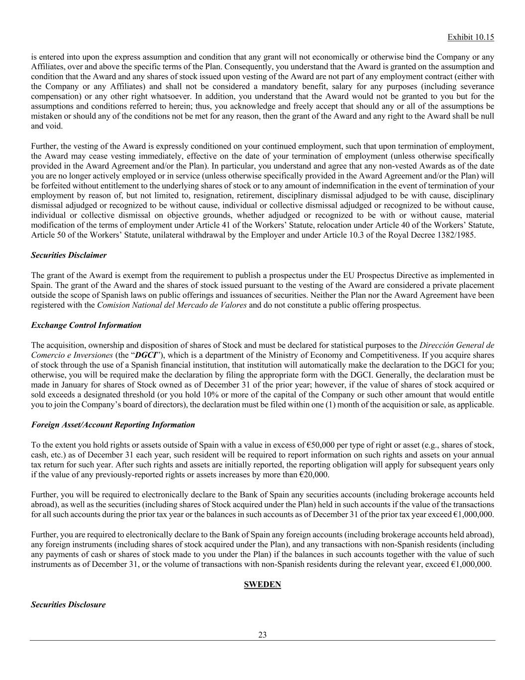 Exhibit 10.15 23 is entered into upon the express assumption and condition that any grant will not economically or otherwise bind the Company or any Affiliates, over and above the specific terms of the Plan. Consequently, you understand that the Award is granted on the assumption and condition that the Award and any shares of stock issued upon vesting of the Award are not part of any employment contract (either with the Company or any Affiliates) and shall not be considered a mandatory benefit, salary for any purposes (including severance compensation) or any other right whatsoever. In addition, you understand that the Award would not be granted to you but for the assumptions and conditions referred to herein; thus, you acknowledge and freely accept that should any or all of the assumptions be mistaken or should any of the conditions not be met for any reason, then the grant of the Award and any right to the Award shall be null and void. Further, the vesting of the Award is expressly conditioned on your continued employment, such that upon termination of employment, the Award may cease vesting immediately, effective on the date of your termination of employment (unless otherwise specifically provided in the Award Agreement and/or the Plan). In particular, you understand and agree that any non-vested Awards as of the date you are no longer actively employed or in service (unless otherwise specifically provided in the Award Agreement and/or the Plan) will be forfeited without entitlement to the underlying shares of stock or to any amount of indemnification in the event of termination of your employment by reason of, but not limited to, resignation, retirement, disciplinary dismissal adjudged to be with cause, disciplinary dismissal adjudged or recognized to be without cause, individual or collective dismissal adjudged or recognized to be without cause, individual or collective dismissal on objective grounds, whether adjudged or recognized to be with or without cause, material modification of the terms of employment under Article 41 of the Workers’ Statute, relocation under Article 40 of the Workers’ Statute, Article 50 of the Workers’ Statute, unilateral withdrawal by the Employer and under Article 10.3 of the Royal Decree 1382/1985. Securities Disclaimer The grant of the Award is exempt from the requirement to publish a prospectus under the EU Prospectus Directive as implemented in Spain. The grant of the Award and the shares of stock issued pursuant to the vesting of the Award are considered a private placement outside the scope of Spanish laws on public offerings and issuances of securities. Neither the Plan nor the Award Agreement have been registered with the Comision National del Mercado de Valores and do not constitute a public offering prospectus. Exchange Control Information The acquisition, ownership and disposition of shares of Stock and must be declared for statistical purposes to the Direcciόn General de Comercio e Inversiones (the “DGCI”), which is a department of the Ministry of Economy and Competitiveness. If you acquire shares of stock through the use of a Spanish financial institution, that institution will automatically make the declaration to the DGCI for you; otherwise, you will be required make the declaration by filing the appropriate form with the DGCI. Generally, the declaration must be made in January for shares of Stock owned as of December 31 of the prior year; however, if the value of shares of stock acquired or sold exceeds a designated threshold (or you hold 10% or more of the capital of the Company or such other amount that would entitle you to join the Company’s board of directors), the declaration must be filed within one (1) month of the acquisition or sale, as applicable. Foreign Asset/Account Reporting Information To the extent you hold rights or assets outside of Spain with a value in excess of €50,000 per type of right or asset (e.g., shares of stock, cash, etc.) as of December 31 each year, such resident will be required to report information on such rights and assets on your annual tax return for such year. After such rights and assets are initially reported, the reporting obligation will apply for subsequent years only if the value of any previously-reported rights or assets increases by more than €20,000. Further, you will be required to electronically declare to the Bank of Spain any securities accounts (including brokerage accounts held abroad), as well as the securities (including shares of Stock acquired under the Plan) held in such accounts if the value of the transactions for all such accounts during the prior tax year or the balances in such accounts as of December 31 of the prior tax year exceed €1,000,000. Further, you are required to electronically declare to the Bank of Spain any foreign accounts (including brokerage accounts held abroad), any foreign instruments (including shares of stock acquired under the Plan), and any transactions with non-Spanish residents (including any payments of cash or shares of stock made to you under the Plan) if the balances in such accounts together with the value of such instruments as of December 31, or the volume of transactions with non-Spanish residents during the relevant year, exceed €1,000,000. SWEDEN Securities Disclosure