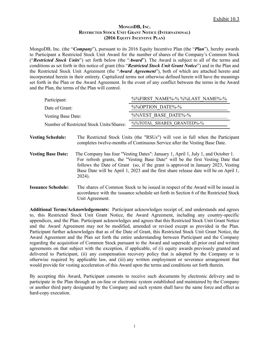 Exhibit 10.3 MONGODB, INC. RESTRICTED STOCK UNIT GRANT NOTICE (INTERNATIONAL) (2016 EQUITY INCENTIVE PLAN) MongoDB, Inc. (the “Company”), pursuant to its 2016 Equity Incentive Plan (the “Plan”), hereby awards to Participant a Restricted Stock Unit Award for the number of shares of the Company’s Common Stock (“Restricted Stock Units”) set forth below (the “Award”). The Award is subject to all of the terms and conditions as set forth in this notice of grant (this “Restricted Stock Unit Grant Notice”) and in the Plan and the Restricted Stock Unit Agreement (the “Award Agreement”), both of which are attached hereto and incorporated herein in their entirety. Capitalized terms not otherwise defined herein will have the meanings set forth in the Plan or the Award Agreement. In the event of any conflict between the terms in the Award and the Plan, the terms of the Plan will control. Participant: %%FIRST_NAME%-% %%LAST_NAME%-% Date of Grant: %%OPTION_DATE%-% Vesting Base Date: %%VEST_BASE_DATE%-% Number of Restricted Stock Units/Shares: %%TOTAL_SHARES_GRANTED%-% Vesting Schedule: The Restricted Stock Units (the "RSUs") will vest in full when the Participant completes twelve-months of Continuous Service after the Vesting Base Date. Vesting Base Date: The Company has four "Vesting Dates": January 1, April 1, July 1, and October 1. For refresh grants, the "Vesting Base Date" will be the first Vesting Date that follows the Date of Grant (so, if the grant is approved in January 2023, Vesting Base Date will be April 1, 2023 and the first share release date will be on April 1, 2024). Issuance Schedule: The shares of Common Stock to be issued in respect of the Award will be issued in accordance with the issuance schedule set forth in Section 6 of the Restricted Stock Unit Agreement. Additional Terms/Acknowledgements: Participant acknowledges receipt of, and understands and agrees to, this Restricted Stock Unit Grant Notice, the Award Agreement, including any country-specific appendices, and the Plan. Participant acknowledges and agrees that this Restricted Stock Unit Grant Notice and the Award Agreement may not be modified, amended or revised except as provided in the Plan. Participant further acknowledges that as of the Date of Grant, this Restricted Stock Unit Grant Notice, the Award Agreement and the Plan set forth the entire understanding between Participant and the Company regarding the acquisition of Common Stock pursuant to the Award and supersede all prior oral and written agreements on that subject with the exception, if applicable, of (i) equity awards previously granted and delivered to Participant, (ii) any compensation recovery policy that is adopted by the Company or is otherwise required by applicable law, and (iii) any written employment or severance arrangement that would provide for vesting acceleration of this Award upon the terms and conditions set forth therein. By accepting this Award, Participant consents to receive such documents by electronic delivery and to participate in the Plan through an on-line or electronic system established and maintained by the Company or another third party designated by the Company and such system shall have the same force and effect as hard-copy execution. 1