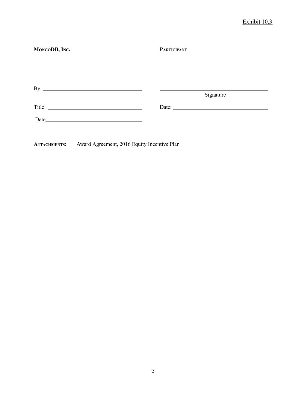 Exhibit 10.3 MONGODB, INC. PARTICIPANT By: Signature Date: ATTACHMENTS: Award Agreement, 2016 Equity Incentive Plan 2