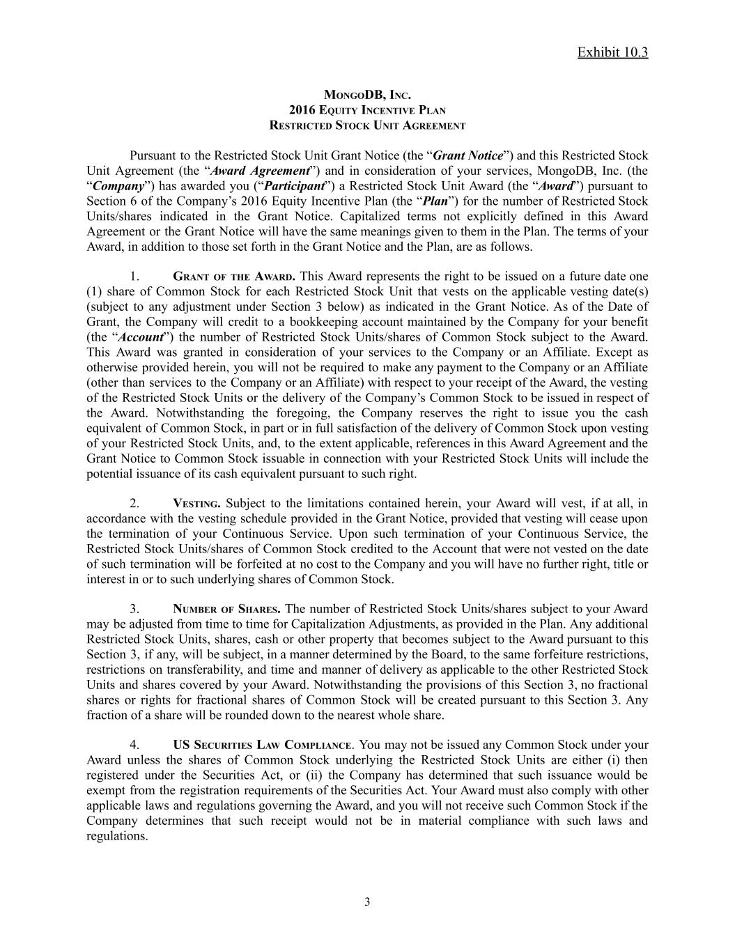 Exhibit 10.3 MONGODB, INC. 2016 EQUITY INCENTIVE PLAN RESTRICTED STOCK UNIT AGREEMENT Pursuant to the Restricted Stock Unit Grant Notice (the “Grant Notice”) and this Restricted Stock Unit Agreement (the “Award Agreement”) and in consideration of your services, MongoDB, Inc. (the “Company”) has awarded you (“Participant”) a Restricted Stock Unit Award (the “Award”) pursuant to Section 6 of the Company’s 2016 Equity Incentive Plan (the “Plan”) for the number of Restricted Stock Units/shares indicated in the Grant Notice. Capitalized terms not explicitly defined in this Award Agreement or the Grant Notice will have the same meanings given to them in the Plan. The terms of your Award, in addition to those set forth in the Grant Notice and the Plan, are as follows. 1. GRANT OF THE AWARD. This Award represents the right to be issued on a future date one (1) share of Common Stock for each Restricted Stock Unit that vests on the applicable vesting date(s) (subject to any adjustment under Section 3 below) as indicated in the Grant Notice. As of the Date of Grant, the Company will credit to a bookkeeping account maintained by the Company for your benefit (the “Account”) the number of Restricted Stock Units/shares of Common Stock subject to the Award. This Award was granted in consideration of your services to the Company or an Affiliate. Except as otherwise provided herein, you will not be required to make any payment to the Company or an Affiliate (other than services to the Company or an Affiliate) with respect to your receipt of the Award, the vesting of the Restricted Stock Units or the delivery of the Company’s Common Stock to be issued in respect of the Award. Notwithstanding the foregoing, the Company reserves the right to issue you the cash equivalent of Common Stock, in part or in full satisfaction of the delivery of Common Stock upon vesting of your Restricted Stock Units, and, to the extent applicable, references in this Award Agreement and the Grant Notice to Common Stock issuable in connection with your Restricted Stock Units will include the potential issuance of its cash equivalent pursuant to such right. 2. VESTING. Subject to the limitations contained herein, your Award will vest, if at all, in accordance with the vesting schedule provided in the Grant Notice, provided that vesting will cease upon the termination of your Continuous Service. Upon such termination of your Continuous Service, the Restricted Stock Units/shares of Common Stock credited to the Account that were not vested on the date of such termination will be forfeited at no cost to the Company and you will have no further right, title or interest in or to such underlying shares of Common Stock. 3. NUMBER OF SHARES. The number of Restricted Stock Units/shares subject to your Award may be adjusted from time to time for Capitalization Adjustments, as provided in the Plan. Any additional Restricted Stock Units, shares, cash or other property that becomes subject to the Award pursuant to this Section 3, if any, will be subject, in a manner determined by the Board, to the same forfeiture restrictions, restrictions on transferability, and time and manner of delivery as applicable to the other Restricted Stock Units and shares covered by your Award. Notwithstanding the provisions of this Section 3, no fractional shares or rights for fractional shares of Common Stock will be created pursuant to this Section 3. Any fraction of a share will be rounded down to the nearest whole share. 4. US SECURITIES LAW COMPLIANCE. You may not be issued any Common Stock under your Award unless the shares of Common Stock underlying the Restricted Stock Units are either (i) then registered under the Securities Act, or (ii) the Company has determined that such issuance would be exempt from the registration requirements of the Securities Act. Your Award must also comply with other applicable laws and regulations governing the Award, and you will not receive such Common Stock if the Company determines that such receipt would not be in material compliance with such laws and regulations. 3