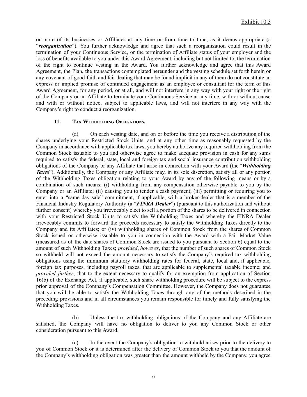 Exhibit 10.3 or more of its businesses or Affiliates at any time or from time to time, as it deems appropriate (a “reorganization”). You further acknowledge and agree that such a reorganization could result in the termination of your Continuous Service, or the termination of Affiliate status of your employer and the loss of benefits available to you under this Award Agreement, including but not limited to, the termination of the right to continue vesting in the Award. You further acknowledge and agree that this Award Agreement, the Plan, the transactions contemplated hereunder and the vesting schedule set forth herein or any covenant of good faith and fair dealing that may be found implicit in any of them do not constitute an express or implied promise of continued engagement as an employee or consultant for the term of this Award Agreement, for any period, or at all, and will not interfere in any way with your right or the right of the Company or an Affiliate to terminate your Continuous Service at any time, with or without cause and with or without notice, subject to applicable laws, and will not interfere in any way with the Company’s right to conduct a reorganization. 11. TAX WITHHOLDING OBLIGATIONS. (a) On each vesting date, and on or before the time you receive a distribution of the shares underlying your Restricted Stock Units, and at any other time as reasonably requested by the Company in accordance with applicable tax laws, you hereby authorize any required withholding from the Common Stock issuable to you and otherwise agree to make adequate provision in cash for any sums required to satisfy the federal, state, local and foreign tax and social insurance contribution withholding obligations of the Company or any Affiliate that arise in connection with your Award (the “Withholding Taxes”). Additionally, the Company or any Affiliate may, in its sole discretion, satisfy all or any portion of the Withholding Taxes obligation relating to your Award by any of the following means or by a combination of such means: (i) withholding from any compensation otherwise payable to you by the Company or an Affiliate; (ii) causing you to tender a cash payment; (iii) permitting or requiring you to enter into a “same day sale” commitment, if applicable, with a broker-dealer that is a member of the Financial Industry Regulatory Authority (a “FINRA Dealer”) (pursuant to this authorization and without further consent) whereby you irrevocably elect to sell a portion of the shares to be delivered in connection with your Restricted Stock Units to satisfy the Withholding Taxes and whereby the FINRA Dealer irrevocably commits to forward the proceeds necessary to satisfy the Withholding Taxes directly to the Company and its Affiliates; or (iv) withholding shares of Common Stock from the shares of Common Stock issued or otherwise issuable to you in connection with the Award with a Fair Market Value (measured as of the date shares of Common Stock are issued to you pursuant to Section 6) equal to the amount of such Withholding Taxes; provided, however, that the number of such shares of Common Stock so withheld will not exceed the amount necessary to satisfy the Company’s required tax withholding obligations using the minimum statutory withholding rates for federal, state, local and, if applicable, foreign tax purposes, including payroll taxes, that are applicable to supplemental taxable income; and provided further, that to the extent necessary to qualify for an exemption from application of Section 16(b) of the Exchange Act, if applicable, such share withholding procedure will be subject to the express prior approval of the Company’s Compensation Committee. However, the Company does not guarantee that you will be able to satisfy the Withholding Taxes through any of the methods described in the preceding provisions and in all circumstances you remain responsible for timely and fully satisfying the Withholding Taxes. (b) Unless the tax withholding obligations of the Company and any Affiliate are satisfied, the Company will have no obligation to deliver to you any Common Stock or other consideration pursuant to this Award. (c) In the event the Company’s obligation to withhold arises prior to the delivery to you of Common Stock or it is determined after the delivery of Common Stock to you that the amount of the Company’s withholding obligation was greater than the amount withheld by the Company, you agree 6
