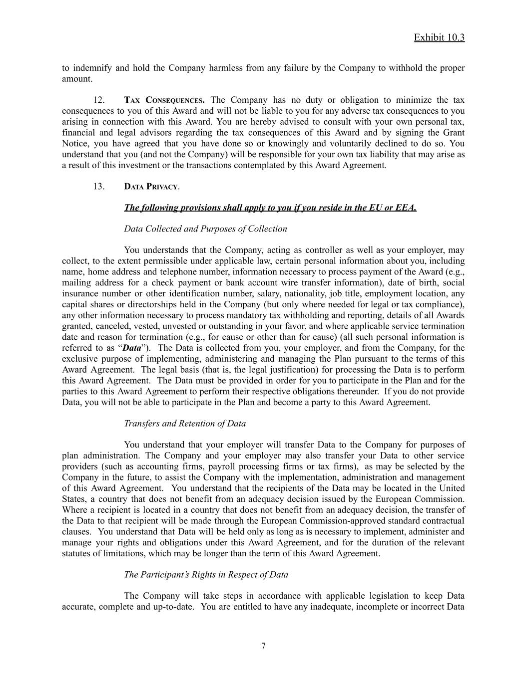 Exhibit 10.3 to indemnify and hold the Company harmless from any failure by the Company to withhold the proper amount. 12. TAX CONSEQUENCES. The Company has no duty or obligation to minimize the tax consequences to you of this Award and will not be liable to you for any adverse tax consequences to you arising in connection with this Award. You are hereby advised to consult with your own personal tax, financial and legal advisors regarding the tax consequences of this Award and by signing the Grant Notice, you have agreed that you have done so or knowingly and voluntarily declined to do so. You understand that you (and not the Company) will be responsible for your own tax liability that may arise as a result of this investment or the transactions contemplated by this Award Agreement. 13. DATA PRIVACY. The following provisions shall apply to you if you reside in the EU or EEA. Data Collected and Purposes of Collection You understands that the Company, acting as controller as well as your employer, may collect, to the extent permissible under applicable law, certain personal information about you, including name, home address and telephone number, information necessary to process payment of the Award (e.g., mailing address for a check payment or bank account wire transfer information), date of birth, social insurance number or other identification number, salary, nationality, job title, employment location, any capital shares or directorships held in the Company (but only where needed for legal or tax compliance), any other information necessary to process mandatory tax withholding and reporting, details of all Awards granted, canceled, vested, unvested or outstanding in your favor, and where applicable service termination date and reason for termination (e.g., for cause or other than for cause) (all such personal information is referred to as “Data”). The Data is collected from you, your employer, and from the Company, for the exclusive purpose of implementing, administering and managing the Plan pursuant to the terms of this Award Agreement. The legal basis (that is, the legal justification) for processing the Data is to perform this Award Agreement. The Data must be provided in order for you to participate in the Plan and for the parties to this Award Agreement to perform their respective obligations thereunder. If you do not provide Data, you will not be able to participate in the Plan and become a party to this Award Agreement. Transfers and Retention of Data You understand that your employer will transfer Data to the Company for purposes of plan administration. The Company and your employer may also transfer your Data to other service providers (such as accounting firms, payroll processing firms or tax firms), as may be selected by the Company in the future, to assist the Company with the implementation, administration and management of this Award Agreement. You understand that the recipients of the Data may be located in the United States, a country that does not benefit from an adequacy decision issued by the European Commission. Where a recipient is located in a country that does not benefit from an adequacy decision, the transfer of the Data to that recipient will be made through the European Commission-approved standard contractual clauses. You understand that Data will be held only as long as is necessary to implement, administer and manage your rights and obligations under this Award Agreement, and for the duration of the relevant statutes of limitations, which may be longer than the term of this Award Agreement. The Participant’s Rights in Respect of Data The Company will take steps in accordance with applicable legislation to keep Data accurate, complete and up-to-date. You are entitled to have any inadequate, incomplete or incorrect Data 7