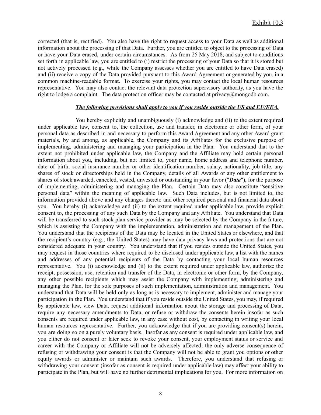 Exhibit 10.3 corrected (that is, rectified). You also have the right to request access to your Data as well as additional information about the processing of that Data. Further, you are entitled to object to the processing of Data or have your Data erased, under certain circumstances. As from 25 May 2018, and subject to conditions set forth in applicable law, you are entitled to (i) restrict the processing of your Data so that it is stored but not actively processed (e.g., while the Company assesses whether you are entitled to have Data erased) and (ii) receive a copy of the Data provided pursuant to this Award Agreement or generated by you, in a common machine-readable format. To exercise your rights, you may contact the local human resources representative. You may also contact the relevant data protection supervisory authority, as you have the right to lodge a complaint. The data protection officer may be contacted at privacy@mongodb.com. The following provisions shall apply to you if you reside outside the US and EU/EEA. You hereby explicitly and unambiguously (i) acknowledge and (ii) to the extent required under applicable law, consent to, the collection, use and transfer, in electronic or other form, of your personal data as described in and necessary to perform this Award Agreement and any other Award grant materials, by and among, as applicable, the Company and its Affiliates for the exclusive purpose of implementing, administering and managing your participation in the Plan. You understand that to the extent not prohibited under applicable law, the Company and the Affiliate may hold certain personal information about you, including, but not limited to, your name, home address and telephone number, date of birth, social insurance number or other identification number, salary, nationality, job title, any shares of stock or directorships held in the Company, details of all Awards or any other entitlement to shares of stock awarded, canceled, vested, unvested or outstanding in your favor ("Data"), for the purpose of implementing, administering and managing the Plan. Certain Data may also constitute “sensitive personal data” within the meaning of applicable law. Such Data includes, but is not limited to, the information provided above and any changes thereto and other required personal and financial data about you. You hereby (i) acknowledge and (ii) to the extent required under applicable law, provide explicit consent to, the processing of any such Data by the Company and any Affiliate. You understand that Data will be transferred to such stock plan service provider as may be selected by the Company in the future, which is assisting the Company with the implementation, administration and management of the Plan. You understand that the recipients of the Data may be located in the United States or elsewhere, and that the recipient’s country (e.g., the United States) may have data privacy laws and protections that are not considered adequate in your country. You understand that if you resides outside the United States, you may request in those countries where required to be disclosed under applicable law, a list with the names and addresses of any potential recipients of the Data by contacting your local human resources representative. You (i) acknowledge and (ii) to the extent required under applicable law, authorize the receipt, possession, use, retention and transfer of the Data, in electronic or other form, by the Company, any other possible recipients which may assist the Company with implementing, administering and managing the Plan, for the sole purposes of such implementation, administration and management. You understand that Data will be held only as long as is necessary to implement, administer and manage your participation in the Plan. You understand that if you reside outside the United States, you may, if required by applicable law, view Data, request additional information about the storage and processing of Data, require any necessary amendments to Data, or refuse or withdraw the consents herein insofar as such consents are required under applicable law, in any case without cost, by contacting in writing your local human resources representative. Further, you acknowledge that if you are providing consent(s) herein, you are doing so on a purely voluntary basis. Insofar as any consent is required under applicable law, and you either do not consent or later seek to revoke your consent, your employment status or service and career with the Company or Affiliate will not be adversely affected; the only adverse consequence of refusing or withdrawing your consent is that the Company will not be able to grant you options or other equity awards or administer or maintain such awards. Therefore, you understand that refusing or withdrawing your consent (insofar as consent is required under applicable law) may affect your ability to participate in the Plan, but will have no further detrimental implications for you. For more information on 8