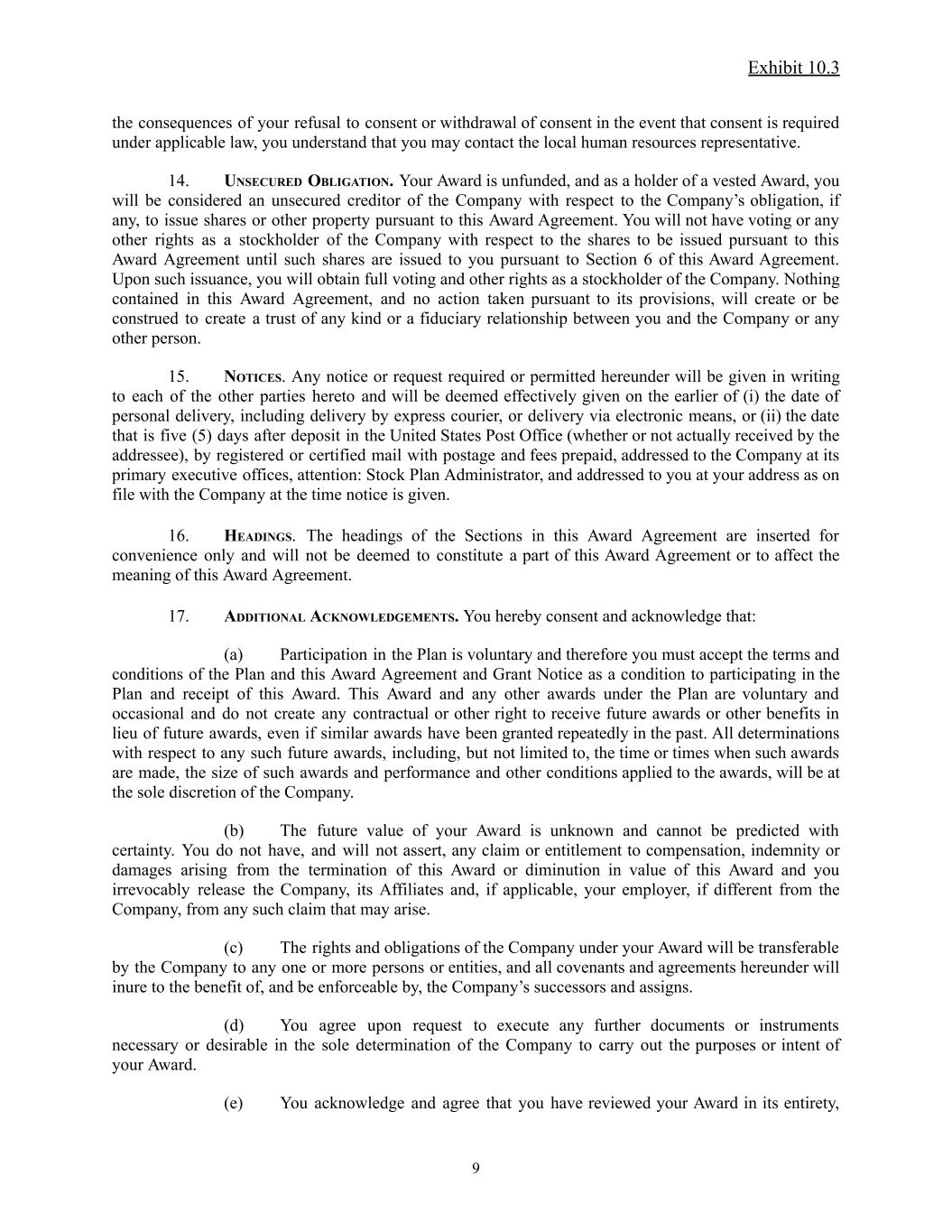 Exhibit 10.3 the consequences of your refusal to consent or withdrawal of consent in the event that consent is required under applicable law, you understand that you may contact the local human resources representative. 14. UNSECURED OBLIGATION. Your Award is unfunded, and as a holder of a vested Award, you will be considered an unsecured creditor of the Company with respect to the Company’s obligation, if any, to issue shares or other property pursuant to this Award Agreement. You will not have voting or any other rights as a stockholder of the Company with respect to the shares to be issued pursuant to this Award Agreement until such shares are issued to you pursuant to Section 6 of this Award Agreement. Upon such issuance, you will obtain full voting and other rights as a stockholder of the Company. Nothing contained in this Award Agreement, and no action taken pursuant to its provisions, will create or be construed to create a trust of any kind or a fiduciary relationship between you and the Company or any other person. 15. NOTICES. Any notice or request required or permitted hereunder will be given in writing to each of the other parties hereto and will be deemed effectively given on the earlier of (i) the date of personal delivery, including delivery by express courier, or delivery via electronic means, or (ii) the date that is five (5) days after deposit in the United States Post Office (whether or not actually received by the addressee), by registered or certified mail with postage and fees prepaid, addressed to the Company at its primary executive offices, attention: Stock Plan Administrator, and addressed to you at your address as on file with the Company at the time notice is given. 16. HEADINGS. The headings of the Sections in this Award Agreement are inserted for convenience only and will not be deemed to constitute a part of this Award Agreement or to affect the meaning of this Award Agreement. 17. ADDITIONAL ACKNOWLEDGEMENTS. You hereby consent and acknowledge that: (a) Participation in the Plan is voluntary and therefore you must accept the terms and conditions of the Plan and this Award Agreement and Grant Notice as a condition to participating in the Plan and receipt of this Award. This Award and any other awards under the Plan are voluntary and occasional and do not create any contractual or other right to receive future awards or other benefits in lieu of future awards, even if similar awards have been granted repeatedly in the past. All determinations with respect to any such future awards, including, but not limited to, the time or times when such awards are made, the size of such awards and performance and other conditions applied to the awards, will be at the sole discretion of the Company. (b) The future value of your Award is unknown and cannot be predicted with certainty. You do not have, and will not assert, any claim or entitlement to compensation, indemnity or damages arising from the termination of this Award or diminution in value of this Award and you irrevocably release the Company, its Affiliates and, if applicable, your employer, if different from the Company, from any such claim that may arise. (c) The rights and obligations of the Company under your Award will be transferable by the Company to any one or more persons or entities, and all covenants and agreements hereunder will inure to the benefit of, and be enforceable by, the Company’s successors and assigns. (d) You agree upon request to execute any further documents or instruments necessary or desirable in the sole determination of the Company to carry out the purposes or intent of your Award. (e) You acknowledge and agree that you have reviewed your Award in its entirety, 9