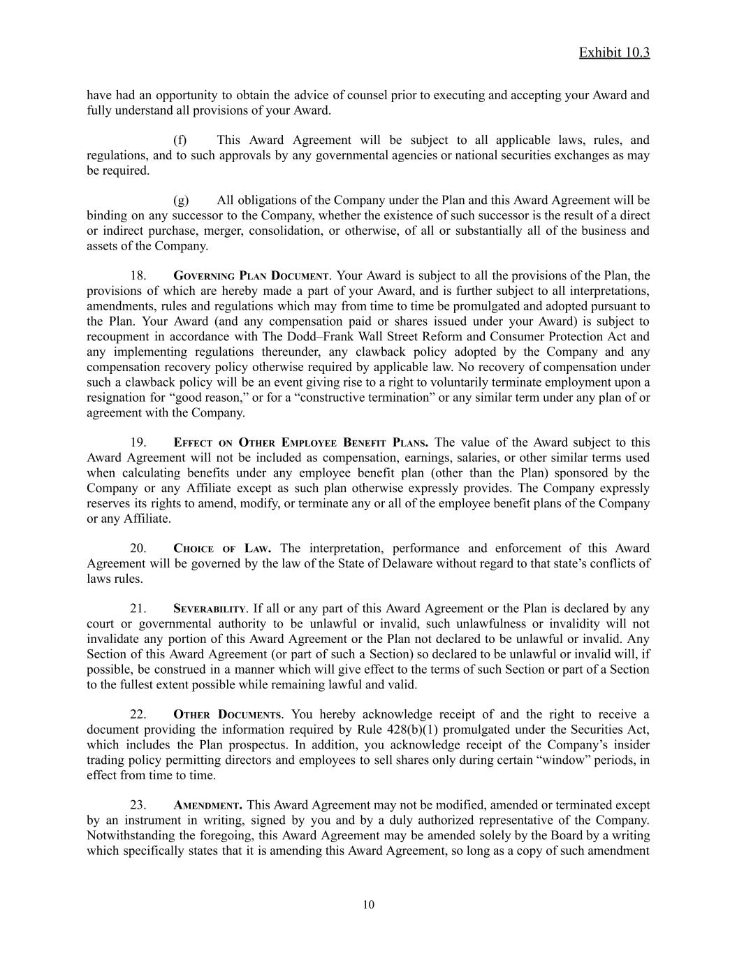 Exhibit 10.3 have had an opportunity to obtain the advice of counsel prior to executing and accepting your Award and fully understand all provisions of your Award. (f) This Award Agreement will be subject to all applicable laws, rules, and regulations, and to such approvals by any governmental agencies or national securities exchanges as may be required. (g) All obligations of the Company under the Plan and this Award Agreement will be binding on any successor to the Company, whether the existence of such successor is the result of a direct or indirect purchase, merger, consolidation, or otherwise, of all or substantially all of the business and assets of the Company. 18. GOVERNING PLAN DOCUMENT. Your Award is subject to all the provisions of the Plan, the provisions of which are hereby made a part of your Award, and is further subject to all interpretations, amendments, rules and regulations which may from time to time be promulgated and adopted pursuant to the Plan. Your Award (and any compensation paid or shares issued under your Award) is subject to recoupment in accordance with The Dodd–Frank Wall Street Reform and Consumer Protection Act and any implementing regulations thereunder, any clawback policy adopted by the Company and any compensation recovery policy otherwise required by applicable law. No recovery of compensation under such a clawback policy will be an event giving rise to a right to voluntarily terminate employment upon a resignation for “good reason,” or for a “constructive termination” or any similar term under any plan of or agreement with the Company. 19. EFFECT ON OTHER EMPLOYEE BENEFIT PLANS. The value of the Award subject to this Award Agreement will not be included as compensation, earnings, salaries, or other similar terms used when calculating benefits under any employee benefit plan (other than the Plan) sponsored by the Company or any Affiliate except as such plan otherwise expressly provides. The Company expressly reserves its rights to amend, modify, or terminate any or all of the employee benefit plans of the Company or any Affiliate. 20. CHOICE OF LAW. The interpretation, performance and enforcement of this Award Agreement will be governed by the law of the State of Delaware without regard to that state’s conflicts of laws rules. 21. SEVERABILITY. If all or any part of this Award Agreement or the Plan is declared by any court or governmental authority to be unlawful or invalid, such unlawfulness or invalidity will not invalidate any portion of this Award Agreement or the Plan not declared to be unlawful or invalid. Any Section of this Award Agreement (or part of such a Section) so declared to be unlawful or invalid will, if possible, be construed in a manner which will give effect to the terms of such Section or part of a Section to the fullest extent possible while remaining lawful and valid. 22. OTHER DOCUMENTS. You hereby acknowledge receipt of and the right to receive a document providing the information required by Rule 428(b)(1) promulgated under the Securities Act, which includes the Plan prospectus. In addition, you acknowledge receipt of the Company’s insider trading policy permitting directors and employees to sell shares only during certain “window” periods, in effect from time to time. 23. AMENDMENT. This Award Agreement may not be modified, amended or terminated except by an instrument in writing, signed by you and by a duly authorized representative of the Company. Notwithstanding the foregoing, this Award Agreement may be amended solely by the Board by a writing which specifically states that it is amending this Award Agreement, so long as a copy of such amendment 10