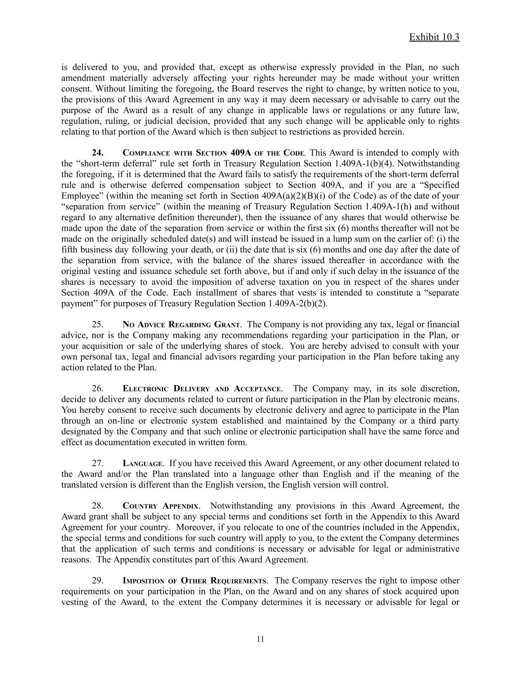 Exhibit 10.3 is delivered to you, and provided that, except as otherwise expressly provided in the Plan, no such amendment materially adversely affecting your rights hereunder may be made without your written consent. Without limiting the foregoing, the Board reserves the right to change, by written notice to you, the provisions of this Award Agreement in any way it may deem necessary or advisable to carry out the purpose of the Award as a result of any change in applicable laws or regulations or any future law, regulation, ruling, or judicial decision, provided that any such change will be applicable only to rights relating to that portion of the Award which is then subject to restrictions as provided herein. 24. COMPLIANCE WITH SECTION 409A OF THE CODE. This Award is intended to comply with the “short-term deferral” rule set forth in Treasury Regulation Section 1.409A-1(b)(4). Notwithstanding the foregoing, if it is determined that the Award fails to satisfy the requirements of the short-term deferral rule and is otherwise deferred compensation subject to Section 409A, and if you are a “Specified Employee” (within the meaning set forth in Section 409A(a)(2)(B)(i) of the Code) as of the date of your “separation from service” (within the meaning of Treasury Regulation Section 1.409A-1(h) and without regard to any alternative definition thereunder), then the issuance of any shares that would otherwise be made upon the date of the separation from service or within the first six (6) months thereafter will not be made on the originally scheduled date(s) and will instead be issued in a lump sum on the earlier of: (i) the fifth business day following your death, or (ii) the date that is six (6) months and one day after the date of the separation from service, with the balance of the shares issued thereafter in accordance with the original vesting and issuance schedule set forth above, but if and only if such delay in the issuance of the shares is necessary to avoid the imposition of adverse taxation on you in respect of the shares under Section 409A of the Code. Each installment of shares that vests is intended to constitute a “separate payment” for purposes of Treasury Regulation Section 1.409A-2(b)(2). 25. NO ADVICE REGARDING GRANT. The Company is not providing any tax, legal or financial advice, nor is the Company making any recommendations regarding your participation in the Plan, or your acquisition or sale of the underlying shares of stock. You are hereby advised to consult with your own personal tax, legal and financial advisors regarding your participation in the Plan before taking any action related to the Plan. 26. ELECTRONIC DELIVERY AND ACCEPTANCE. The Company may, in its sole discretion, decide to deliver any documents related to current or future participation in the Plan by electronic means. You hereby consent to receive such documents by electronic delivery and agree to participate in the Plan through an on-line or electronic system established and maintained by the Company or a third party designated by the Company and that such online or electronic participation shall have the same force and effect as documentation executed in written form. 27. LANGUAGE. If you have received this Award Agreement, or any other document related to the Award and/or the Plan translated into a language other than English and if the meaning of the translated version is different than the English version, the English version will control. 28. COUNTRY APPENDIX. Notwithstanding any provisions in this Award Agreement, the Award grant shall be subject to any special terms and conditions set forth in the Appendix to this Award Agreement for your country. Moreover, if you relocate to one of the countries included in the Appendix, the special terms and conditions for such country will apply to you, to the extent the Company determines that the application of such terms and conditions is necessary or advisable for legal or administrative reasons. The Appendix constitutes part of this Award Agreement. 29. IMPOSITION OF OTHER REQUIREMENTS. The Company reserves the right to impose other requirements on your participation in the Plan, on the Award and on any shares of stock acquired upon vesting of the Award, to the extent the Company determines it is necessary or advisable for legal or 11