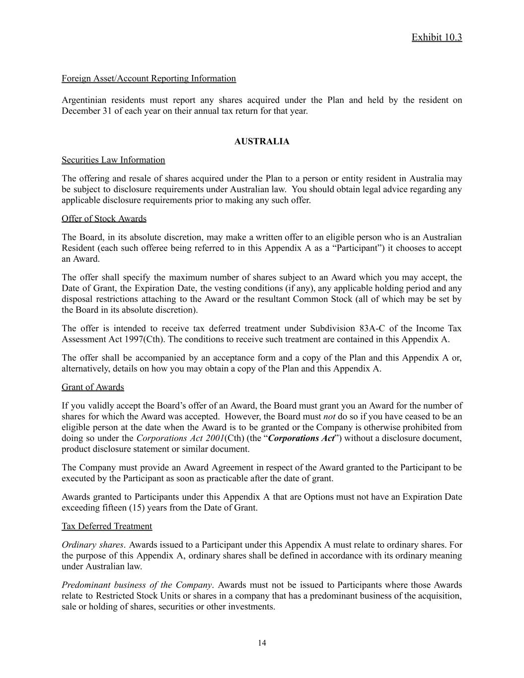 Exhibit 10.3 Foreign Asset/Account Reporting Information Argentinian residents must report any shares acquired under the Plan and held by the resident on December 31 of each year on their annual tax return for that year. AUSTRALIA Securities Law Information The offering and resale of shares acquired under the Plan to a person or entity resident in Australia may be subject to disclosure requirements under Australian law. You should obtain legal advice regarding any applicable disclosure requirements prior to making any such offer. Offer of Stock Awards The Board, in its absolute discretion, may make a written offer to an eligible person who is an Australian Resident (each such offeree being referred to in this Appendix A as a “Participant”) it chooses to accept an Award. The offer shall specify the maximum number of shares subject to an Award which you may accept, the Date of Grant, the Expiration Date, the vesting conditions (if any), any applicable holding period and any disposal restrictions attaching to the Award or the resultant Common Stock (all of which may be set by the Board in its absolute discretion). The offer is intended to receive tax deferred treatment under Subdivision 83A-C of the Income Tax Assessment Act 1997(Cth). The conditions to receive such treatment are contained in this Appendix A. The offer shall be accompanied by an acceptance form and a copy of the Plan and this Appendix A or, alternatively, details on how you may obtain a copy of the Plan and this Appendix A. Grant of Awards If you validly accept the Board’s offer of an Award, the Board must grant you an Award for the number of shares for which the Award was accepted. However, the Board must not do so if you have ceased to be an eligible person at the date when the Award is to be granted or the Company is otherwise prohibited from doing so under the Corporations Act 2001(Cth) (the “Corporations Act”) without a disclosure document, product disclosure statement or similar document. The Company must provide an Award Agreement in respect of the Award granted to the Participant to be executed by the Participant as soon as practicable after the date of grant. Awards granted to Participants under this Appendix A that are Options must not have an Expiration Date exceeding fifteen (15) years from the Date of Grant. Tax Deferred Treatment Ordinary shares. Awards issued to a Participant under this Appendix A must relate to ordinary shares. For the purpose of this Appendix A, ordinary shares shall be defined in accordance with its ordinary meaning under Australian law. Predominant business of the Company. Awards must not be issued to Participants where those Awards relate to Restricted Stock Units or shares in a company that has a predominant business of the acquisition, sale or holding of shares, securities or other investments. 14