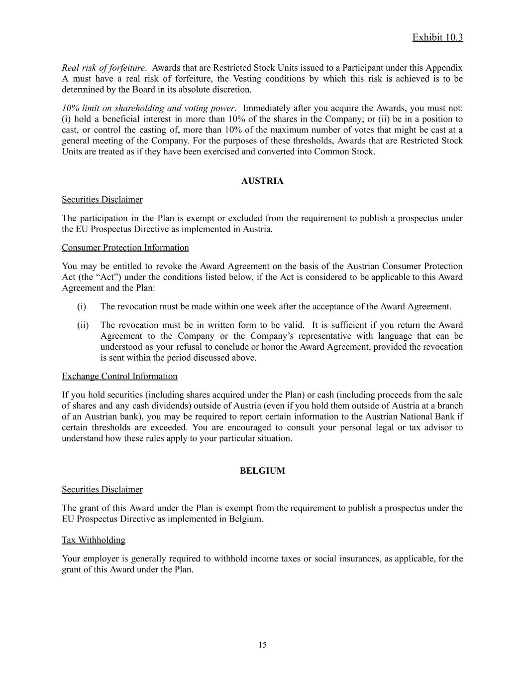 Exhibit 10.3 Real risk of forfeiture. Awards that are Restricted Stock Units issued to a Participant under this Appendix A must have a real risk of forfeiture, the Vesting conditions by which this risk is achieved is to be determined by the Board in its absolute discretion. 10% limit on shareholding and voting power. Immediately after you acquire the Awards, you must not: (i) hold a beneficial interest in more than 10% of the shares in the Company; or (ii) be in a position to cast, or control the casting of, more than 10% of the maximum number of votes that might be cast at a general meeting of the Company. For the purposes of these thresholds, Awards that are Restricted Stock Units are treated as if they have been exercised and converted into Common Stock. AUSTRIA Securities Disclaimer The participation in the Plan is exempt or excluded from the requirement to publish a prospectus under the EU Prospectus Directive as implemented in Austria. Consumer Protection Information You may be entitled to revoke the Award Agreement on the basis of the Austrian Consumer Protection Act (the “Act”) under the conditions listed below, if the Act is considered to be applicable to this Award Agreement and the Plan: (i) The revocation must be made within one week after the acceptance of the Award Agreement. (ii) The revocation must be in written form to be valid. It is sufficient if you return the Award Agreement to the Company or the Company’s representative with language that can be understood as your refusal to conclude or honor the Award Agreement, provided the revocation is sent within the period discussed above. Exchange Control Information If you hold securities (including shares acquired under the Plan) or cash (including proceeds from the sale of shares and any cash dividends) outside of Austria (even if you hold them outside of Austria at a branch of an Austrian bank), you may be required to report certain information to the Austrian National Bank if certain thresholds are exceeded. You are encouraged to consult your personal legal or tax advisor to understand how these rules apply to your particular situation. BELGIUM Securities Disclaimer The grant of this Award under the Plan is exempt from the requirement to publish a prospectus under the EU Prospectus Directive as implemented in Belgium. Tax Withholding Your employer is generally required to withhold income taxes or social insurances, as applicable, for the grant of this Award under the Plan. 15