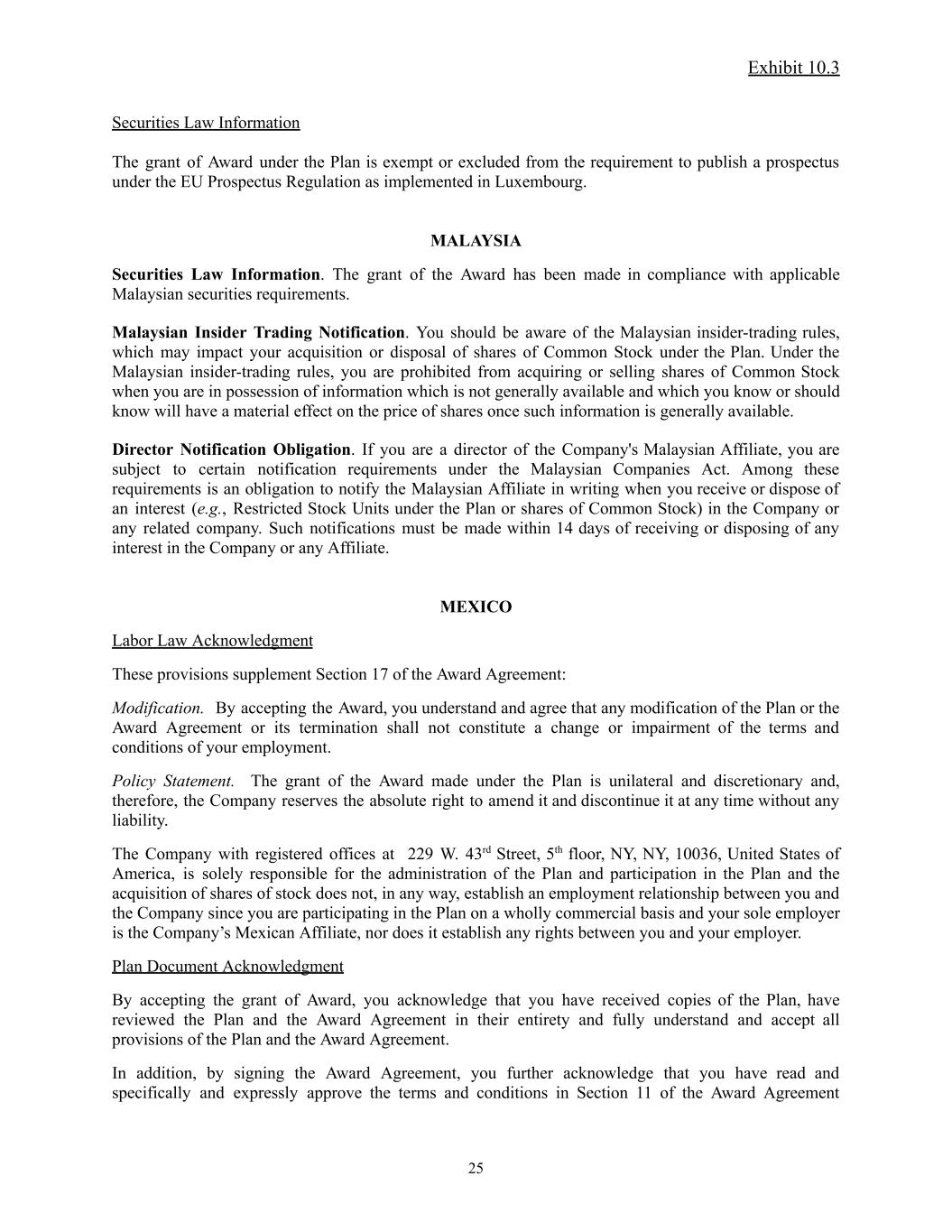 Exhibit 10.3 Securities Law Information The grant of Award under the Plan is exempt or excluded from the requirement to publish a prospectus under the EU Prospectus Regulation as implemented in Luxembourg. MALAYSIA Securities Law Information. The grant of the Award has been made in compliance with applicable Malaysian securities requirements. Malaysian Insider Trading Notification. You should be aware of the Malaysian insider-trading rules, which may impact your acquisition or disposal of shares of Common Stock under the Plan. Under the Malaysian insider-trading rules, you are prohibited from acquiring or selling shares of Common Stock when you are in possession of information which is not generally available and which you know or should know will have a material effect on the price of shares once such information is generally available. Director Notification Obligation. If you are a director of the Company's Malaysian Affiliate, you are subject to certain notification requirements under the Malaysian Companies Act. Among these requirements is an obligation to notify the Malaysian Affiliate in writing when you receive or dispose of an interest (e.g., Restricted Stock Units under the Plan or shares of Common Stock) in the Company or any related company. Such notifications must be made within 14 days of receiving or disposing of any interest in the Company or any Affiliate. MEXICO Labor Law Acknowledgment These provisions supplement Section 17 of the Award Agreement: Modification. By accepting the Award, you understand and agree that any modification of the Plan or the Award Agreement or its termination shall not constitute a change or impairment of the terms and conditions of your employment. Policy Statement. The grant of the Award made under the Plan is unilateral and discretionary and, therefore, the Company reserves the absolute right to amend it and discontinue it at any time without any liability. The Company with registered offices at 229 W. 43rd Street, 5th floor, NY, NY, 10036, United States of America, is solely responsible for the administration of the Plan and participation in the Plan and the acquisition of shares of stock does not, in any way, establish an employment relationship between you and the Company since you are participating in the Plan on a wholly commercial basis and your sole employer is the Company’s Mexican Affiliate, nor does it establish any rights between you and your employer. Plan Document Acknowledgment By accepting the grant of Award, you acknowledge that you have received copies of the Plan, have reviewed the Plan and the Award Agreement in their entirety and fully understand and accept all provisions of the Plan and the Award Agreement. In addition, by signing the Award Agreement, you further acknowledge that you have read and specifically and expressly approve the terms and conditions in Section 11 of the Award Agreement 25