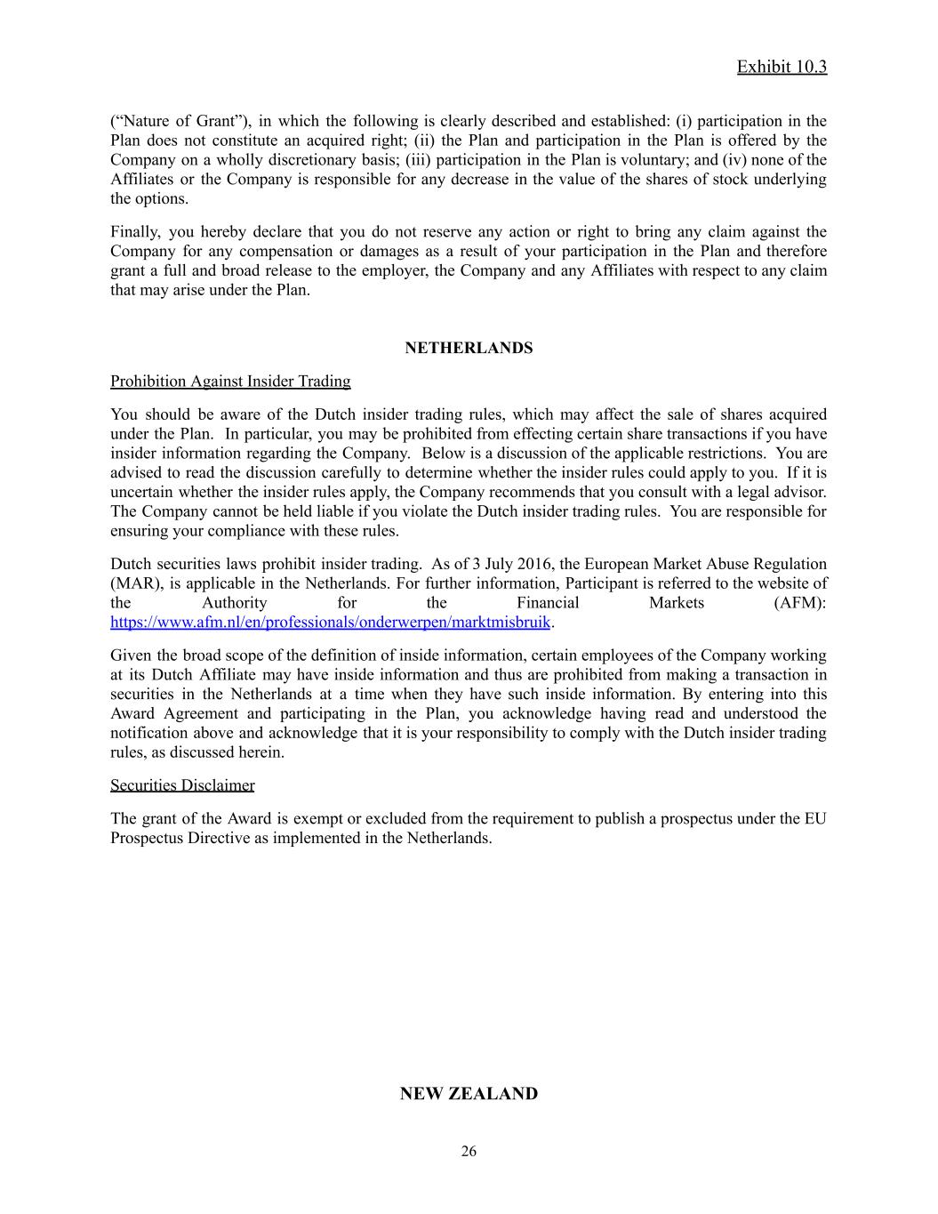 Exhibit 10.3 (“Nature of Grant”), in which the following is clearly described and established: (i) participation in the Plan does not constitute an acquired right; (ii) the Plan and participation in the Plan is offered by the Company on a wholly discretionary basis; (iii) participation in the Plan is voluntary; and (iv) none of the Affiliates or the Company is responsible for any decrease in the value of the shares of stock underlying the options. Finally, you hereby declare that you do not reserve any action or right to bring any claim against the Company for any compensation or damages as a result of your participation in the Plan and therefore grant a full and broad release to the employer, the Company and any Affiliates with respect to any claim that may arise under the Plan. NETHERLANDS Prohibition Against Insider Trading You should be aware of the Dutch insider trading rules, which may affect the sale of shares acquired under the Plan. In particular, you may be prohibited from effecting certain share transactions if you have insider information regarding the Company. Below is a discussion of the applicable restrictions. You are advised to read the discussion carefully to determine whether the insider rules could apply to you. If it is uncertain whether the insider rules apply, the Company recommends that you consult with a legal advisor. The Company cannot be held liable if you violate the Dutch insider trading rules. You are responsible for ensuring your compliance with these rules. Dutch securities laws prohibit insider trading. As of 3 July 2016, the European Market Abuse Regulation (MAR), is applicable in the Netherlands. For further information, Participant is referred to the website of the Authority for the Financial Markets (AFM): https://www.afm.nl/en/professionals/onderwerpen/marktmisbruik. Given the broad scope of the definition of inside information, certain employees of the Company working at its Dutch Affiliate may have inside information and thus are prohibited from making a transaction in securities in the Netherlands at a time when they have such inside information. By entering into this Award Agreement and participating in the Plan, you acknowledge having read and understood the notification above and acknowledge that it is your responsibility to comply with the Dutch insider trading rules, as discussed herein. Securities Disclaimer The grant of the Award is exempt or excluded from the requirement to publish a prospectus under the EU Prospectus Directive as implemented in the Netherlands. NEW ZEALAND 26