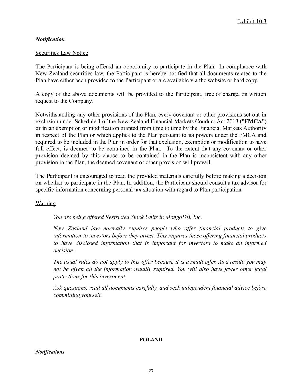 Exhibit 10.3 Notification Securities Law Notice The Participant is being offered an opportunity to participate in the Plan. In compliance with New Zealand securities law, the Participant is hereby notified that all documents related to the Plan have either been provided to the Participant or are available via the website or hard copy. A copy of the above documents will be provided to the Participant, free of charge, on written request to the Company. Notwithstanding any other provisions of the Plan, every covenant or other provisions set out in exclusion under Schedule 1 of the New Zealand Financial Markets Conduct Act 2013 ("FMCA") or in an exemption or modification granted from time to time by the Financial Markets Authority in respect of the Plan or which applies to the Plan pursuant to its powers under the FMCA and required to be included in the Plan in order for that exclusion, exemption or modification to have full effect, is deemed to be contained in the Plan. To the extent that any covenant or other provision deemed by this clause to be contained in the Plan is inconsistent with any other provision in the Plan, the deemed covenant or other provision will prevail. The Participant is encouraged to read the provided materials carefully before making a decision on whether to participate in the Plan. In addition, the Participant should consult a tax advisor for specific information concerning personal tax situation with regard to Plan participation. Warning You are being offered Restricted Stock Units in MongoDB, Inc. New Zealand law normally requires people who offer financial products to give information to investors before they invest. This requires those offering financial products to have disclosed information that is important for investors to make an informed decision. The usual rules do not apply to this offer because it is a small offer. As a result, you may not be given all the information usually required. You will also have fewer other legal protections for this investment. Ask questions, read all documents carefully, and seek independent financial advice before committing yourself. POLAND Notifications 27