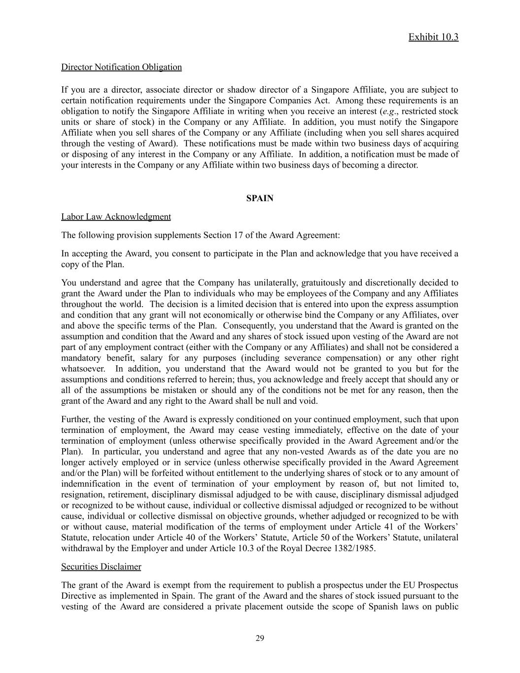 Exhibit 10.3 Director Notification Obligation If you are a director, associate director or shadow director of a Singapore Affiliate, you are subject to certain notification requirements under the Singapore Companies Act. Among these requirements is an obligation to notify the Singapore Affiliate in writing when you receive an interest (e.g., restricted stock units or share of stock) in the Company or any Affiliate. In addition, you must notify the Singapore Affiliate when you sell shares of the Company or any Affiliate (including when you sell shares acquired through the vesting of Award). These notifications must be made within two business days of acquiring or disposing of any interest in the Company or any Affiliate. In addition, a notification must be made of your interests in the Company or any Affiliate within two business days of becoming a director. SPAIN Labor Law Acknowledgment The following provision supplements Section 17 of the Award Agreement: In accepting the Award, you consent to participate in the Plan and acknowledge that you have received a copy of the Plan. You understand and agree that the Company has unilaterally, gratuitously and discretionally decided to grant the Award under the Plan to individuals who may be employees of the Company and any Affiliates throughout the world. The decision is a limited decision that is entered into upon the express assumption and condition that any grant will not economically or otherwise bind the Company or any Affiliates, over and above the specific terms of the Plan. Consequently, you understand that the Award is granted on the assumption and condition that the Award and any shares of stock issued upon vesting of the Award are not part of any employment contract (either with the Company or any Affiliates) and shall not be considered a mandatory benefit, salary for any purposes (including severance compensation) or any other right whatsoever. In addition, you understand that the Award would not be granted to you but for the assumptions and conditions referred to herein; thus, you acknowledge and freely accept that should any or all of the assumptions be mistaken or should any of the conditions not be met for any reason, then the grant of the Award and any right to the Award shall be null and void. Further, the vesting of the Award is expressly conditioned on your continued employment, such that upon termination of employment, the Award may cease vesting immediately, effective on the date of your termination of employment (unless otherwise specifically provided in the Award Agreement and/or the Plan). In particular, you understand and agree that any non-vested Awards as of the date you are no longer actively employed or in service (unless otherwise specifically provided in the Award Agreement and/or the Plan) will be forfeited without entitlement to the underlying shares of stock or to any amount of indemnification in the event of termination of your employment by reason of, but not limited to, resignation, retirement, disciplinary dismissal adjudged to be with cause, disciplinary dismissal adjudged or recognized to be without cause, individual or collective dismissal adjudged or recognized to be without cause, individual or collective dismissal on objective grounds, whether adjudged or recognized to be with or without cause, material modification of the terms of employment under Article 41 of the Workers’ Statute, relocation under Article 40 of the Workers’ Statute, Article 50 of the Workers’ Statute, unilateral withdrawal by the Employer and under Article 10.3 of the Royal Decree 1382/1985. Securities Disclaimer The grant of the Award is exempt from the requirement to publish a prospectus under the EU Prospectus Directive as implemented in Spain. The grant of the Award and the shares of stock issued pursuant to the vesting of the Award are considered a private placement outside the scope of Spanish laws on public 29