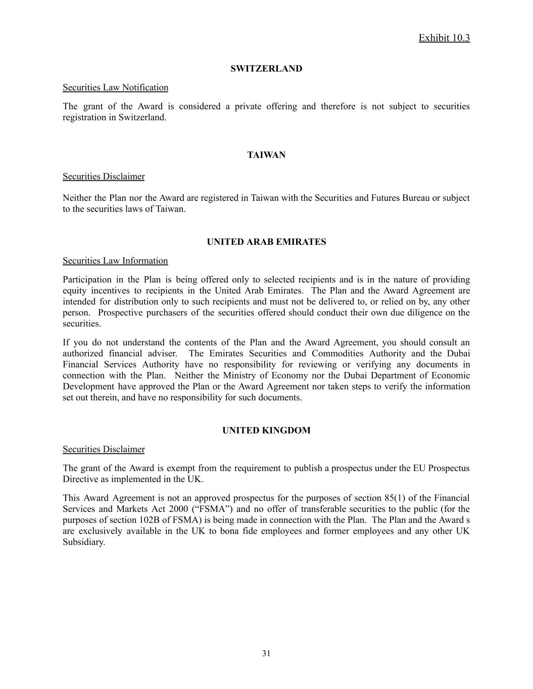Exhibit 10.3 SWITZERLAND Securities Law Notification The grant of the Award is considered a private offering and therefore is not subject to securities registration in Switzerland. TAIWAN Securities Disclaimer Neither the Plan nor the Award are registered in Taiwan with the Securities and Futures Bureau or subject to the securities laws of Taiwan. UNITED ARAB EMIRATES Securities Law Information Participation in the Plan is being offered only to selected recipients and is in the nature of providing equity incentives to recipients in the United Arab Emirates. The Plan and the Award Agreement are intended for distribution only to such recipients and must not be delivered to, or relied on by, any other person. Prospective purchasers of the securities offered should conduct their own due diligence on the securities. If you do not understand the contents of the Plan and the Award Agreement, you should consult an authorized financial adviser. The Emirates Securities and Commodities Authority and the Dubai Financial Services Authority have no responsibility for reviewing or verifying any documents in connection with the Plan. Neither the Ministry of Economy nor the Dubai Department of Economic Development have approved the Plan or the Award Agreement nor taken steps to verify the information set out therein, and have no responsibility for such documents. UNITED KINGDOM Securities Disclaimer The grant of the Award is exempt from the requirement to publish a prospectus under the EU Prospectus Directive as implemented in the UK. This Award Agreement is not an approved prospectus for the purposes of section 85(1) of the Financial Services and Markets Act 2000 (“FSMA”) and no offer of transferable securities to the public (for the purposes of section 102B of FSMA) is being made in connection with the Plan. The Plan and the Award s are exclusively available in the UK to bona fide employees and former employees and any other UK Subsidiary. 31