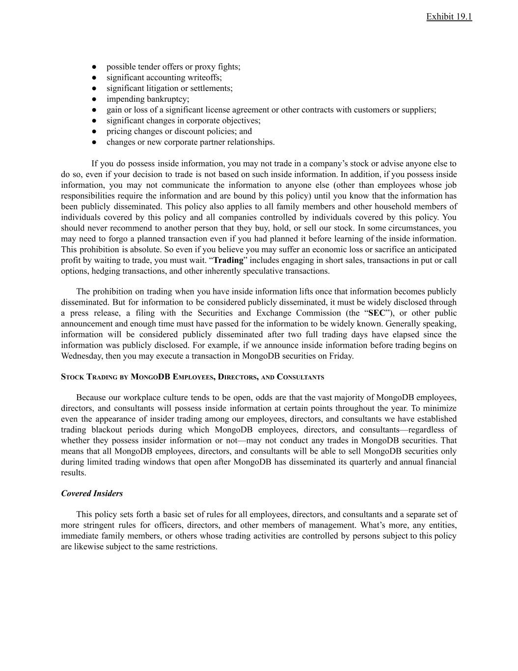 Exhibit 19.1 ● possible tender offers or proxy fights; ● significant accounting writeoffs; ● significant litigation or settlements; ● impending bankruptcy; ● gain or loss of a significant license agreement or other contracts with customers or suppliers; ● significant changes in corporate objectives; ● pricing changes or discount policies; and ● changes or new corporate partner relationships. If you do possess inside information, you may not trade in a company’s stock or advise anyone else to do so, even if your decision to trade is not based on such inside information. In addition, if you possess inside information, you may not communicate the information to anyone else (other than employees whose job responsibilities require the information and are bound by this policy) until you know that the information has been publicly disseminated. This policy also applies to all family members and other household members of individuals covered by this policy and all companies controlled by individuals covered by this policy. You should never recommend to another person that they buy, hold, or sell our stock. In some circumstances, you may need to forgo a planned transaction even if you had planned it before learning of the inside information. This prohibition is absolute. So even if you believe you may suffer an economic loss or sacrifice an anticipated profit by waiting to trade, you must wait. “Trading” includes engaging in short sales, transactions in put or call options, hedging transactions, and other inherently speculative transactions. The prohibition on trading when you have inside information lifts once that information becomes publicly disseminated. But for information to be considered publicly disseminated, it must be widely disclosed through a press release, a filing with the Securities and Exchange Commission (the “SEC”), or other public announcement and enough time must have passed for the information to be widely known. Generally speaking, information will be considered publicly disseminated after two full trading days have elapsed since the information was publicly disclosed. For example, if we announce inside information before trading begins on Wednesday, then you may execute a transaction in MongoDB securities on Friday. STOCK TRADING BY MONGODB EMPLOYEES, DIRECTORS, AND CONSULTANTS Because our workplace culture tends to be open, odds are that the vast majority of MongoDB employees, directors, and consultants will possess inside information at certain points throughout the year. To minimize even the appearance of insider trading among our employees, directors, and consultants we have established trading blackout periods during which MongoDB employees, directors, and consultants—regardless of whether they possess insider information or not—may not conduct any trades in MongoDB securities. That means that all MongoDB employees, directors, and consultants will be able to sell MongoDB securities only during limited trading windows that open after MongoDB has disseminated its quarterly and annual financial results. Covered Insiders This policy sets forth a basic set of rules for all employees, directors, and consultants and a separate set of more stringent rules for officers, directors, and other members of management. What’s more, any entities, immediate family members, or others whose trading activities are controlled by persons subject to this policy are likewise subject to the same restrictions.
