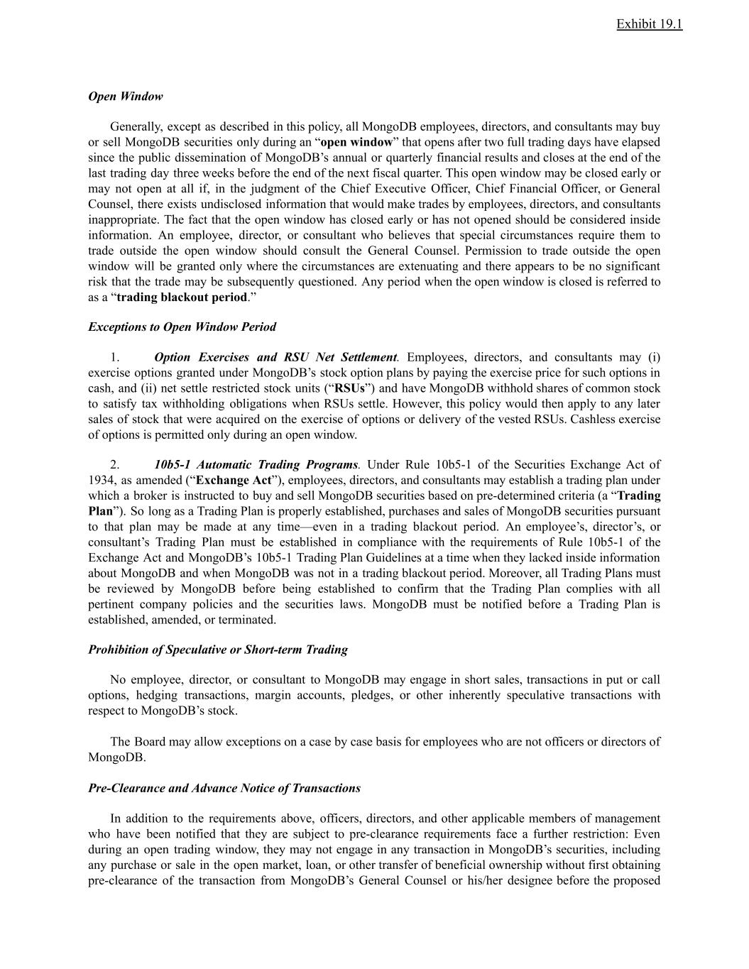 Exhibit 19.1 Open Window Generally, except as described in this policy, all MongoDB employees, directors, and consultants may buy or sell MongoDB securities only during an “open window” that opens after two full trading days have elapsed since the public dissemination of MongoDB’s annual or quarterly financial results and closes at the end of the last trading day three weeks before the end of the next fiscal quarter. This open window may be closed early or may not open at all if, in the judgment of the Chief Executive Officer, Chief Financial Officer, or General Counsel, there exists undisclosed information that would make trades by employees, directors, and consultants inappropriate. The fact that the open window has closed early or has not opened should be considered inside information. An employee, director, or consultant who believes that special circumstances require them to trade outside the open window should consult the General Counsel. Permission to trade outside the open window will be granted only where the circumstances are extenuating and there appears to be no significant risk that the trade may be subsequently questioned. Any period when the open window is closed is referred to as a “trading blackout period.” Exceptions to Open Window Period 1. Option Exercises and RSU Net Settlement. Employees, directors, and consultants may (i) exercise options granted under MongoDB’s stock option plans by paying the exercise price for such options in cash, and (ii) net settle restricted stock units (“RSUs”) and have MongoDB withhold shares of common stock to satisfy tax withholding obligations when RSUs settle. However, this policy would then apply to any later sales of stock that were acquired on the exercise of options or delivery of the vested RSUs. Cashless exercise of options is permitted only during an open window. 2. 10b5-1 Automatic Trading Programs. Under Rule 10b5-1 of the Securities Exchange Act of 1934, as amended (“Exchange Act”), employees, directors, and consultants may establish a trading plan under which a broker is instructed to buy and sell MongoDB securities based on pre-determined criteria (a “Trading Plan”). So long as a Trading Plan is properly established, purchases and sales of MongoDB securities pursuant to that plan may be made at any time—even in a trading blackout period. An employee’s, director’s, or consultant’s Trading Plan must be established in compliance with the requirements of Rule 10b5-1 of the Exchange Act and MongoDB’s 10b5-1 Trading Plan Guidelines at a time when they lacked inside information about MongoDB and when MongoDB was not in a trading blackout period. Moreover, all Trading Plans must be reviewed by MongoDB before being established to confirm that the Trading Plan complies with all pertinent company policies and the securities laws. MongoDB must be notified before a Trading Plan is established, amended, or terminated. Prohibition of Speculative or Short-term Trading No employee, director, or consultant to MongoDB may engage in short sales, transactions in put or call options, hedging transactions, margin accounts, pledges, or other inherently speculative transactions with respect to MongoDB’s stock. The Board may allow exceptions on a case by case basis for employees who are not officers or directors of MongoDB. Pre-Clearance and Advance Notice of Transactions In addition to the requirements above, officers, directors, and other applicable members of management who have been notified that they are subject to pre-clearance requirements face a further restriction: Even during an open trading window, they may not engage in any transaction in MongoDB’s securities, including any purchase or sale in the open market, loan, or other transfer of beneficial ownership without first obtaining pre-clearance of the transaction from MongoDB’s General Counsel or his/her designee before the proposed