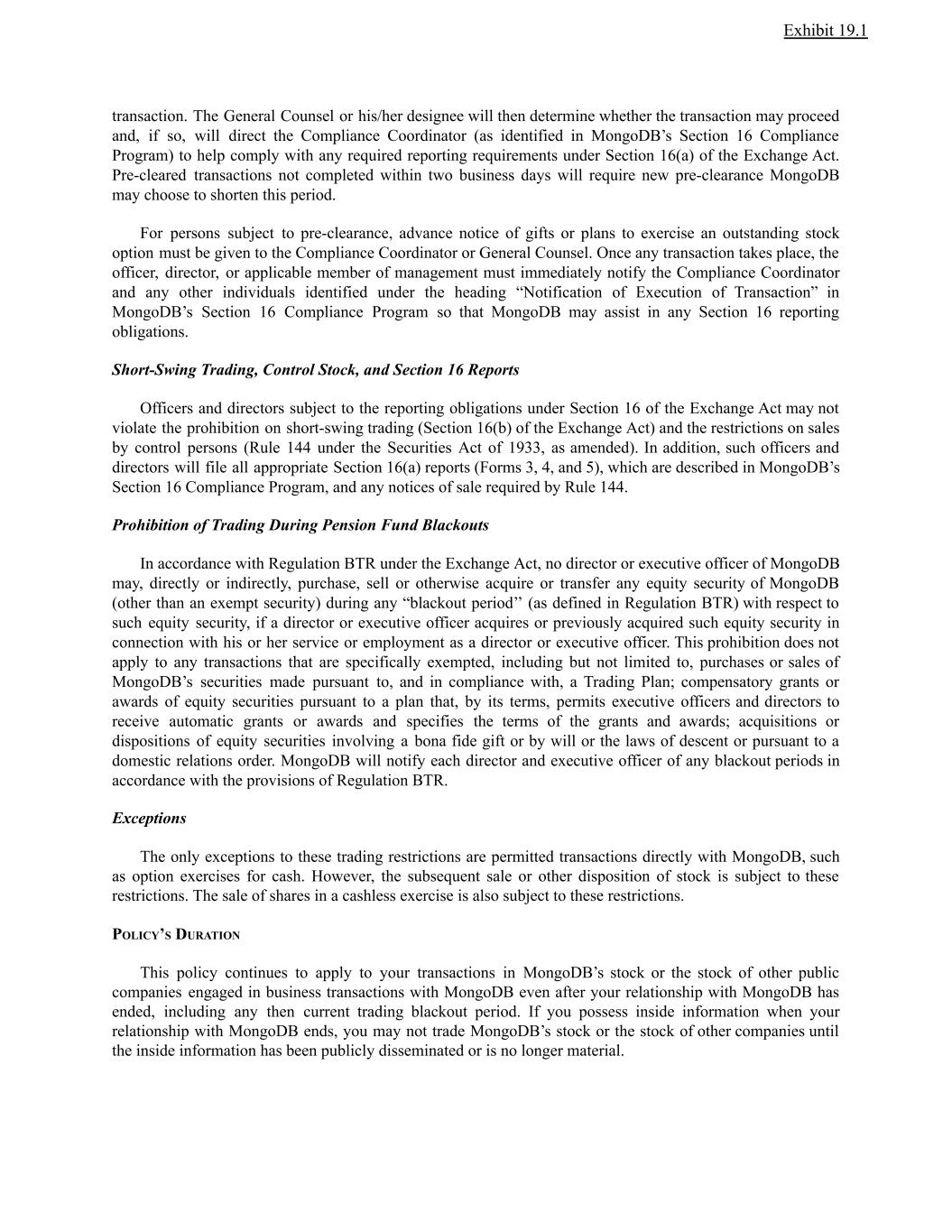 Exhibit 19.1 transaction. The General Counsel or his/her designee will then determine whether the transaction may proceed and, if so, will direct the Compliance Coordinator (as identified in MongoDB’s Section 16 Compliance Program) to help comply with any required reporting requirements under Section 16(a) of the Exchange Act. Pre-cleared transactions not completed within two business days will require new pre-clearance MongoDB may choose to shorten this period. For persons subject to pre-clearance, advance notice of gifts or plans to exercise an outstanding stock option must be given to the Compliance Coordinator or General Counsel. Once any transaction takes place, the officer, director, or applicable member of management must immediately notify the Compliance Coordinator and any other individuals identified under the heading “Notification of Execution of Transaction” in MongoDB’s Section 16 Compliance Program so that MongoDB may assist in any Section 16 reporting obligations. Short-Swing Trading, Control Stock, and Section 16 Reports Officers and directors subject to the reporting obligations under Section 16 of the Exchange Act may not violate the prohibition on short-swing trading (Section 16(b) of the Exchange Act) and the restrictions on sales by control persons (Rule 144 under the Securities Act of 1933, as amended). In addition, such officers and directors will file all appropriate Section 16(a) reports (Forms 3, 4, and 5), which are described in MongoDB’s Section 16 Compliance Program, and any notices of sale required by Rule 144. Prohibition of Trading During Pension Fund Blackouts In accordance with Regulation BTR under the Exchange Act, no director or executive officer of MongoDB may, directly or indirectly, purchase, sell or otherwise acquire or transfer any equity security of MongoDB (other than an exempt security) during any “blackout period’’ (as defined in Regulation BTR) with respect to such equity security, if a director or executive officer acquires or previously acquired such equity security in connection with his or her service or employment as a director or executive officer. This prohibition does not apply to any transactions that are specifically exempted, including but not limited to, purchases or sales of MongoDB’s securities made pursuant to, and in compliance with, a Trading Plan; compensatory grants or awards of equity securities pursuant to a plan that, by its terms, permits executive officers and directors to receive automatic grants or awards and specifies the terms of the grants and awards; acquisitions or dispositions of equity securities involving a bona fide gift or by will or the laws of descent or pursuant to a domestic relations order. MongoDB will notify each director and executive officer of any blackout periods in accordance with the provisions of Regulation BTR. Exceptions The only exceptions to these trading restrictions are permitted transactions directly with MongoDB, such as option exercises for cash. However, the subsequent sale or other disposition of stock is subject to these restrictions. The sale of shares in a cashless exercise is also subject to these restrictions. POLICY’S DURATION This policy continues to apply to your transactions in MongoDB’s stock or the stock of other public companies engaged in business transactions with MongoDB even after your relationship with MongoDB has ended, including any then current trading blackout period. If you possess inside information when your relationship with MongoDB ends, you may not trade MongoDB’s stock or the stock of other companies until the inside information has been publicly disseminated or is no longer material.
